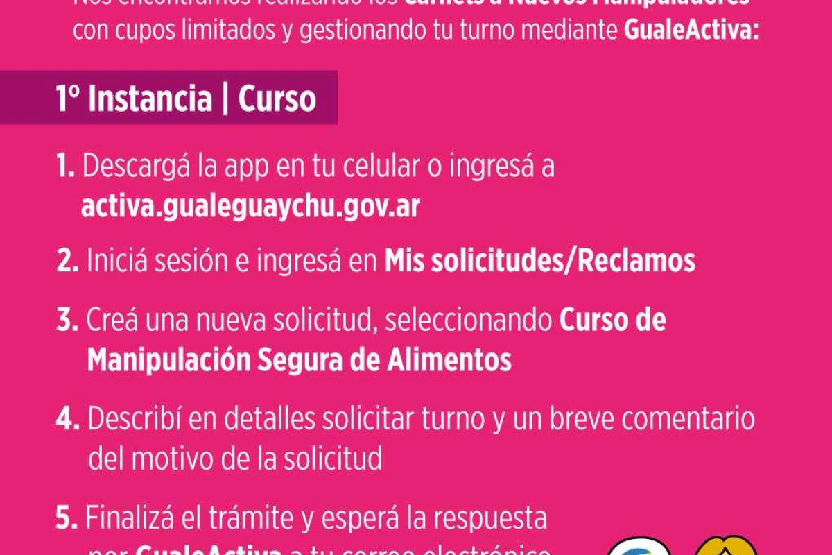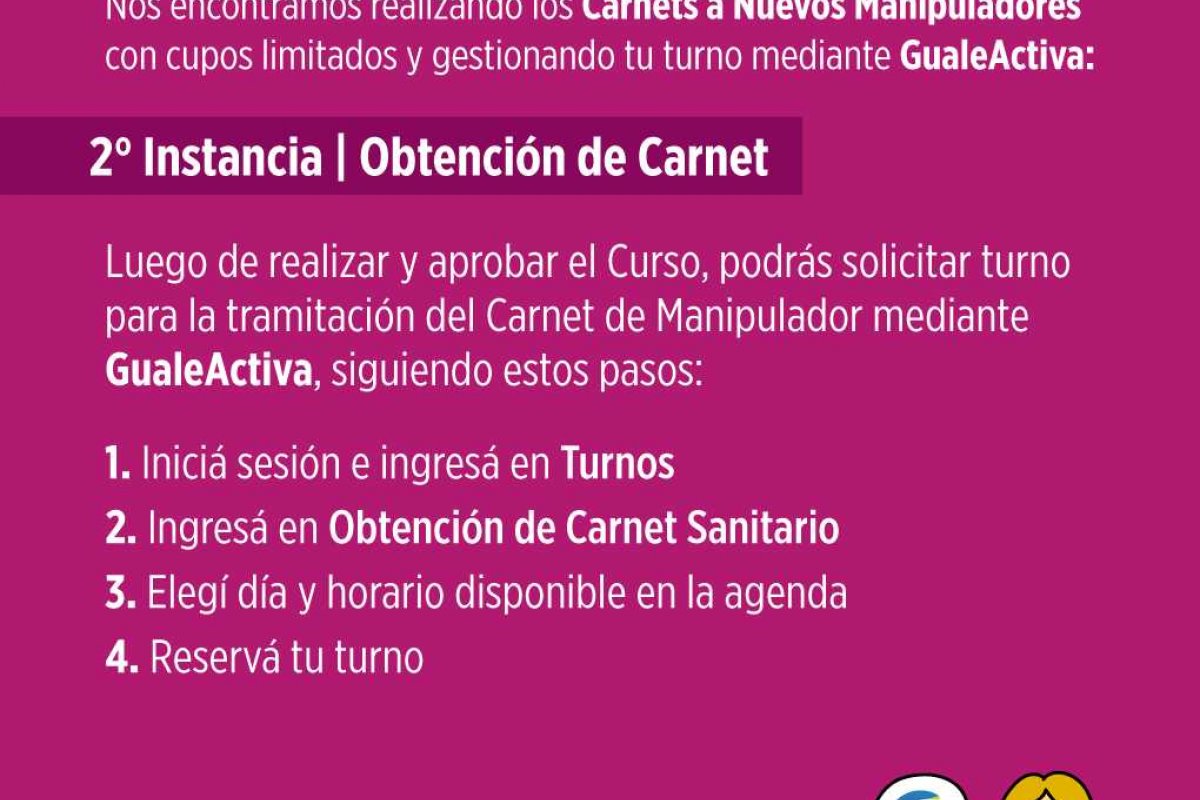 A fin de poder dar respuesta a la demanda generada por una de las actividades exceptuadas del Aislamiento Social, Preventivo y Obligatorio (y que nunca cesó durante la Pandemia) como lo es el rubro alimenticio; la Municipalidad se encuentra realizando las gestiones pertinentes para que aquellas personas que requieren por primera vez el Carnet de Manipulador de Alimentos puedan capacitarse y obtenerlo. Tanto la inscripción a la capacitación como el turno para la tramitación del nuevo Carnet se realizan mediante la Plataforma Digital Municipal - Gualeactiva- lo que permite obtener los turnos de forma muy sencilla desde su celular, tablet o PC.
