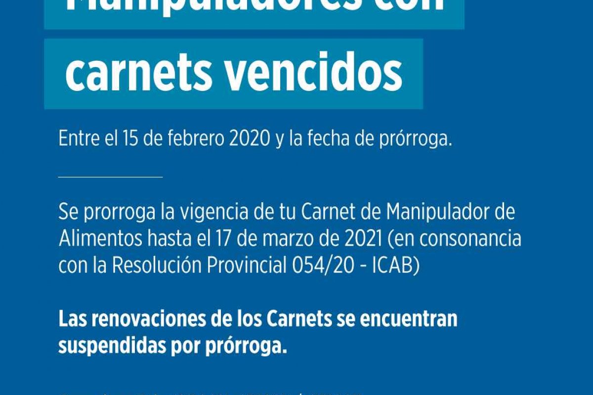 Por otra parte, para aquellos Carnets vencidos después del 15 de febrero de 2020, nuestro Municipio adhiere a la prórroga establecida a nivel Provincial y Nacional. Por ello todas las renovaciones y vencimientos se han prorrogado según Resolución 054/2020 del ICAB (INSTITUTO DE CONTROL DE ALIMENTACIÓN Y BROMATOLOGÍA) en el marco de la Pandemia; la que establece en su Art. 1°…” prorrogar la vigencia hasta el 17 de marzo de 2021 de los Carnets de manipulador de Alimentos emitidos”… Además en su Artículo 2° deja establecido que los titulares de los carnets de Manipulador de alimentos podrán exhibir mencionada Resolución como constancia de prórroga. Destacando que las personas que ya han tramitado su Carnet fueron capacitadas oportunamente.