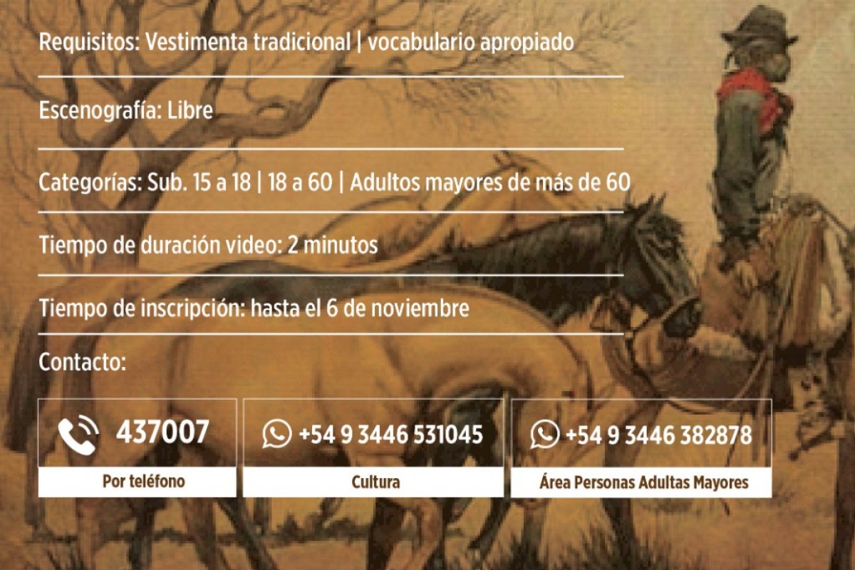 Es por ello que, en estas circunstancias, se realizará un concurso virtual organizado por el área de Personas Adultas Mayores y la dirección de Cultura Municipal, que consiste en la presentación de un “Video Minuto” donde los participantes deberán vestir ropa tipica y recitar un verso gauchesco al grito de “Aro Aro….”.