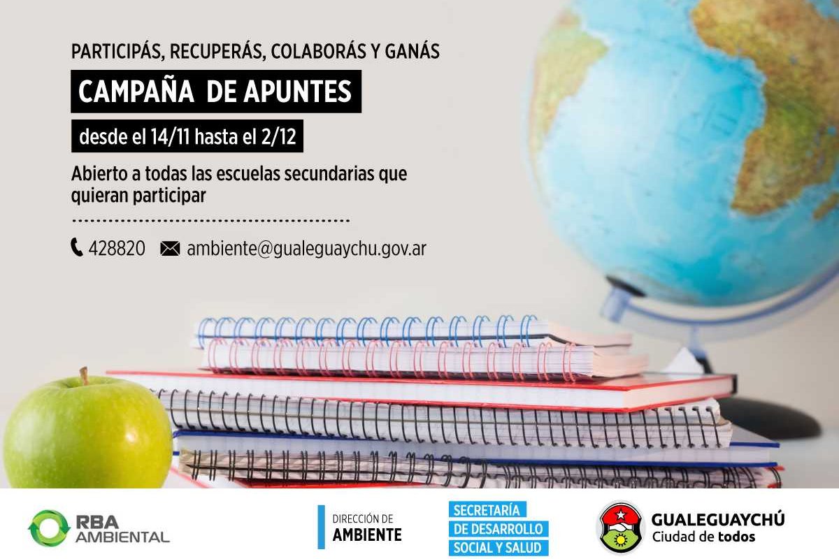 La dirección de Ambiente recuerda a los estudiantes de nivel secundario que el viernes 2 de diciembre finaliza el Concurso de Apuntes. Habrá premios para las dos escuelas ganadoras.