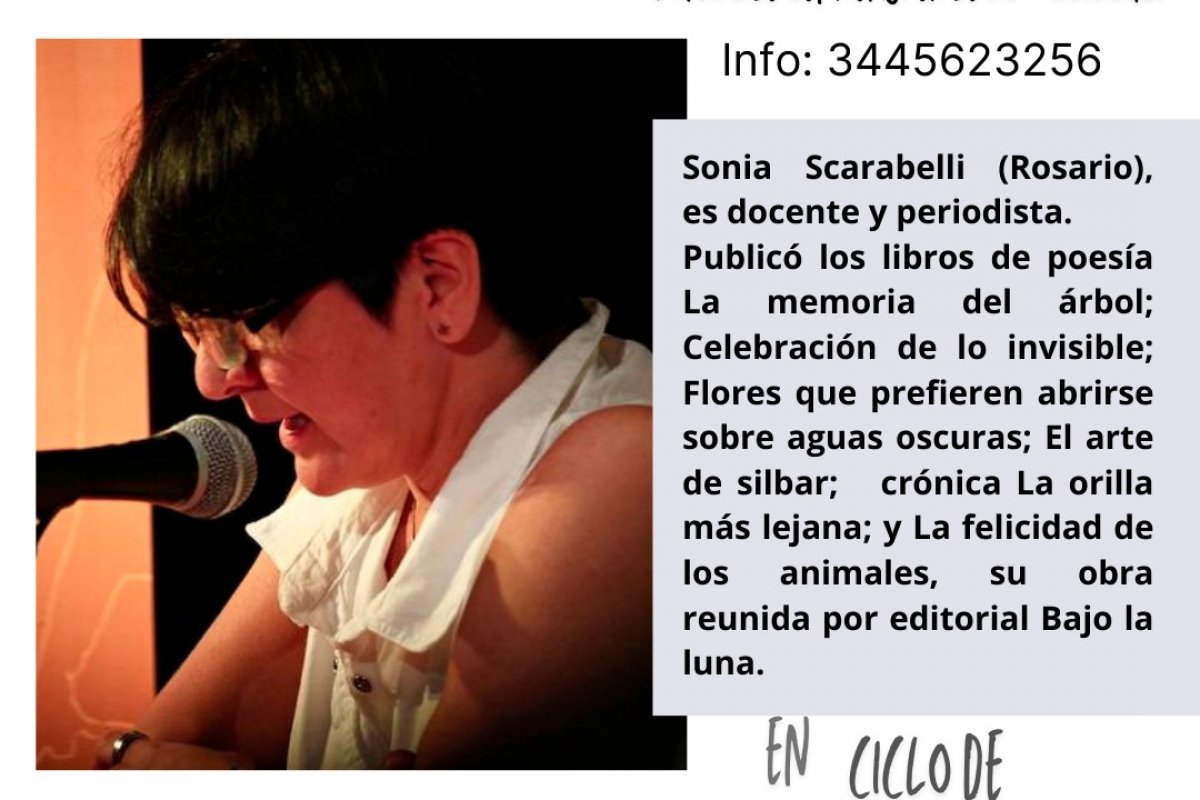 Sobre nuestra invitada: Sonia Scarabelli (Rosario, 1968), es poeta, docente y periodista. Publicó los libros de poesía: La memoria del árbol; Celebración de lo invisible; Flores que prefieren abrirse sobre aguas oscuras; El arte de silbar; crónica La orilla más lejana; y La felicidad de los animales, libro que reúne su obra entre los años 2000-2021.