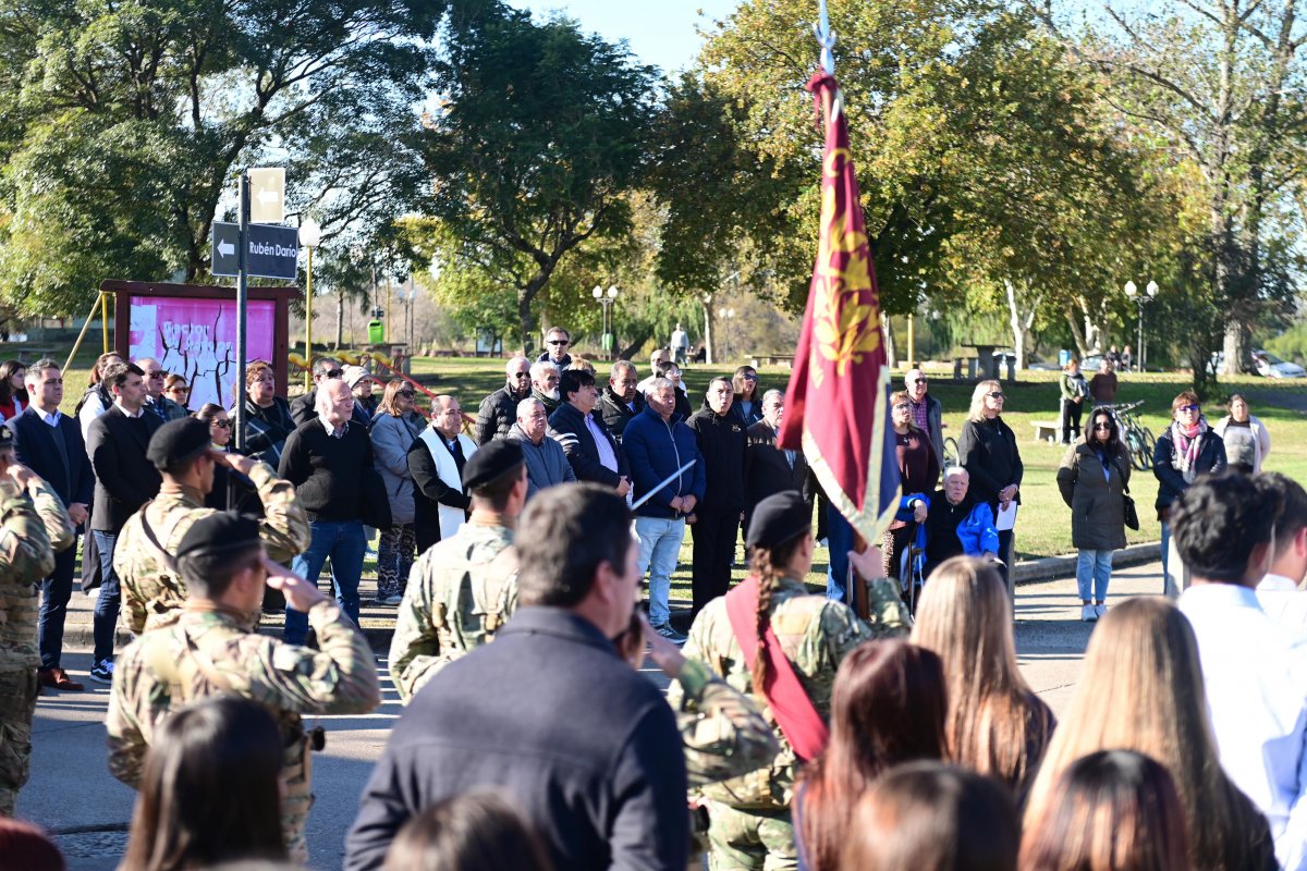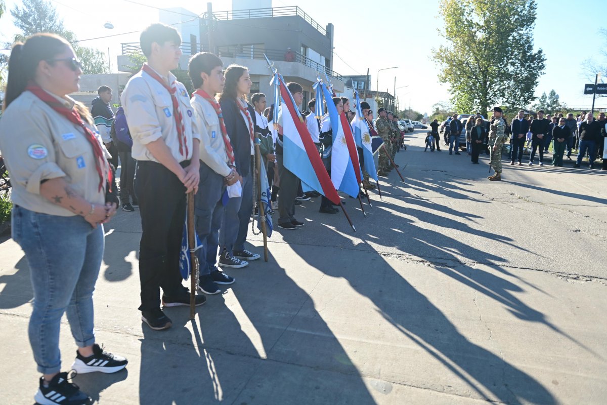 El acto tuvo lugar frente al monumento que lo recuerda, y contó con la presencia de scouts y escuelas que participaron portando las banderas de ceremonia, reafirmando el compromiso con la memoria y el legado de nuestros héroes.