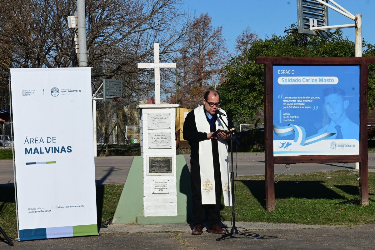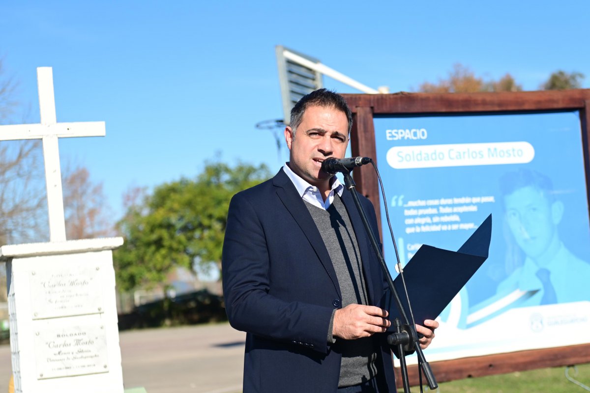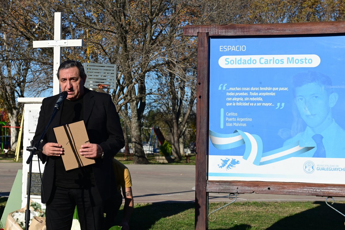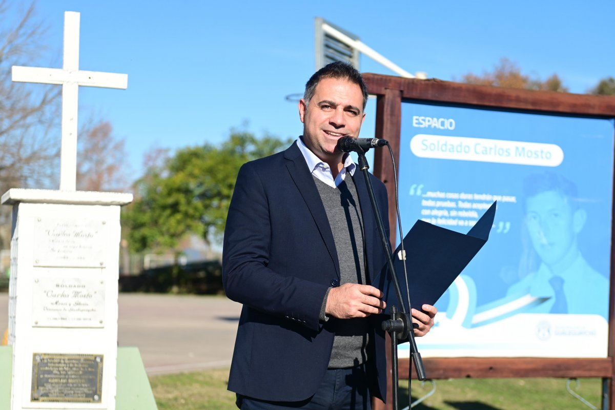 El intendente Mauricio Davico brindó unas sentidas palabras en las que destacó la historia de Carlos Mosto y su ejemplo de humanidad incluso en medio del horror de la guerra: “Carlos fue quien alentaba constantemente a sus compañeros, ayudó a curarlos, les enseñaba a rezar. Cuatro días antes de morir, le escribió a sus padres pidiéndoles que rezaran también por los ingleses, porque eran hermanos nuestros. Eso habla de lo que era Carlos: un joven con una grandeza inmensa, que eligió ir a la guerra para proteger a un compañero aterrorizado”.