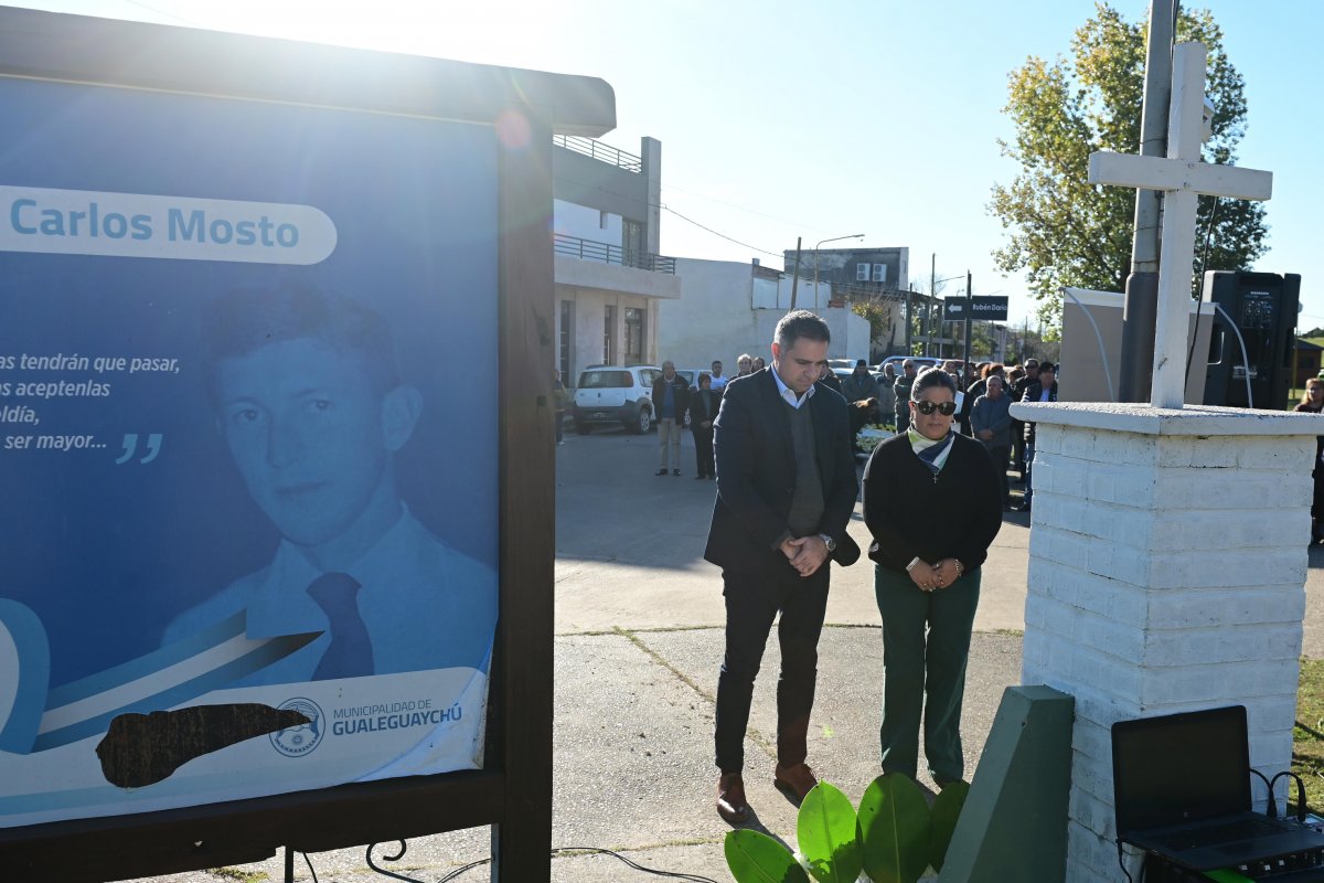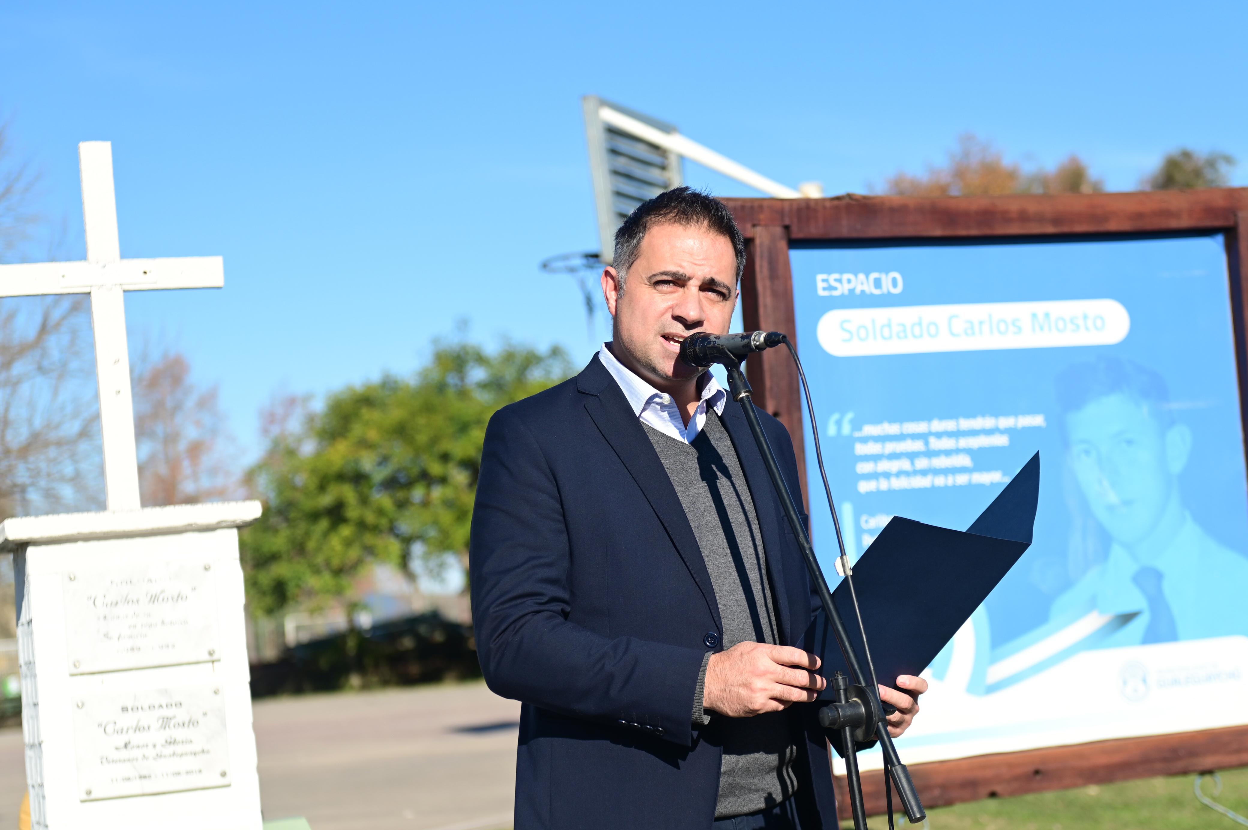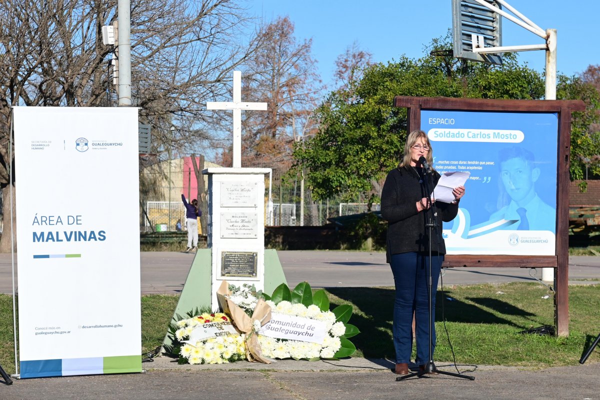 El intendente Mauricio Davico brindó unas sentidas palabras en las que destacó la historia de Carlos Mosto y su ejemplo de humanidad incluso en medio del horror de la guerra: “Carlos fue quien alentaba constantemente a sus compañeros, ayudó a curarlos, les enseñaba a rezar. Cuatro días antes de morir, le escribió a sus padres pidiéndoles que rezaran también por los ingleses, porque eran hermanos nuestros. Eso habla de lo que era Carlos: un joven con una grandeza inmensa, que eligió ir a la guerra para proteger a un compañero aterrorizado”.