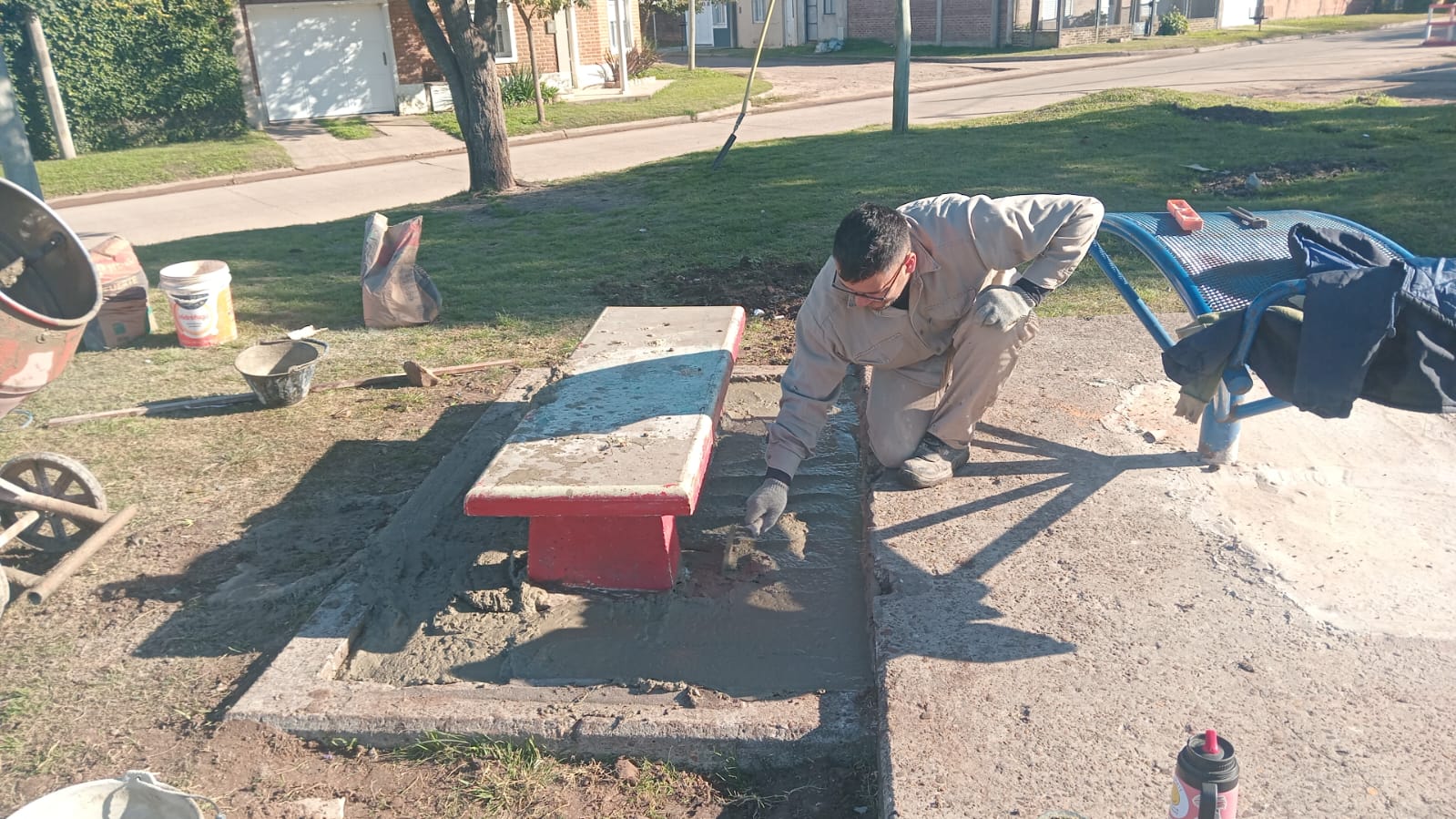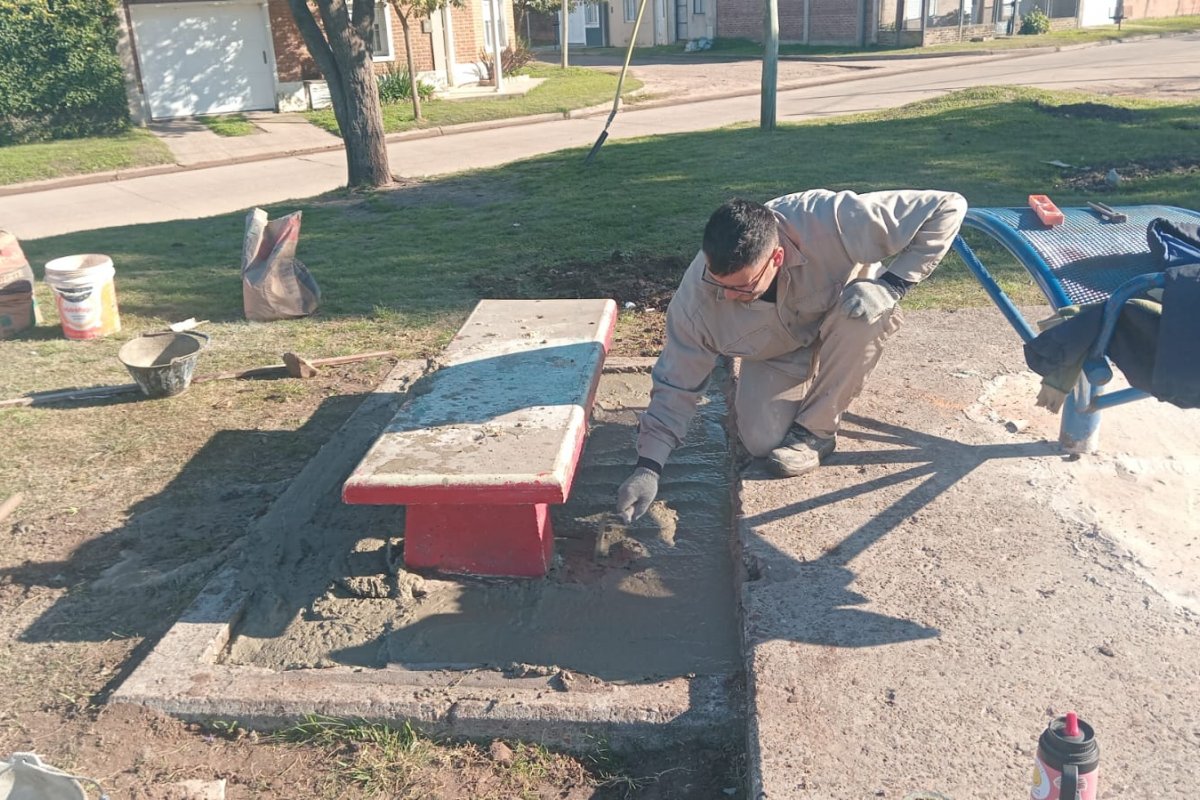 Durante los últimos días se realizaron trabajos de corte de pasto, limpieza general, reparación de bancos, mesas y juegos, así como tareas de reacondicionamiento del mobiliario urbano. Además, desde el taller de carpintería y herrería de la Dirección, con mano de obra municipal, se fabricaron nuevos bancos que serán colocados progresivamente en distintas plazas.