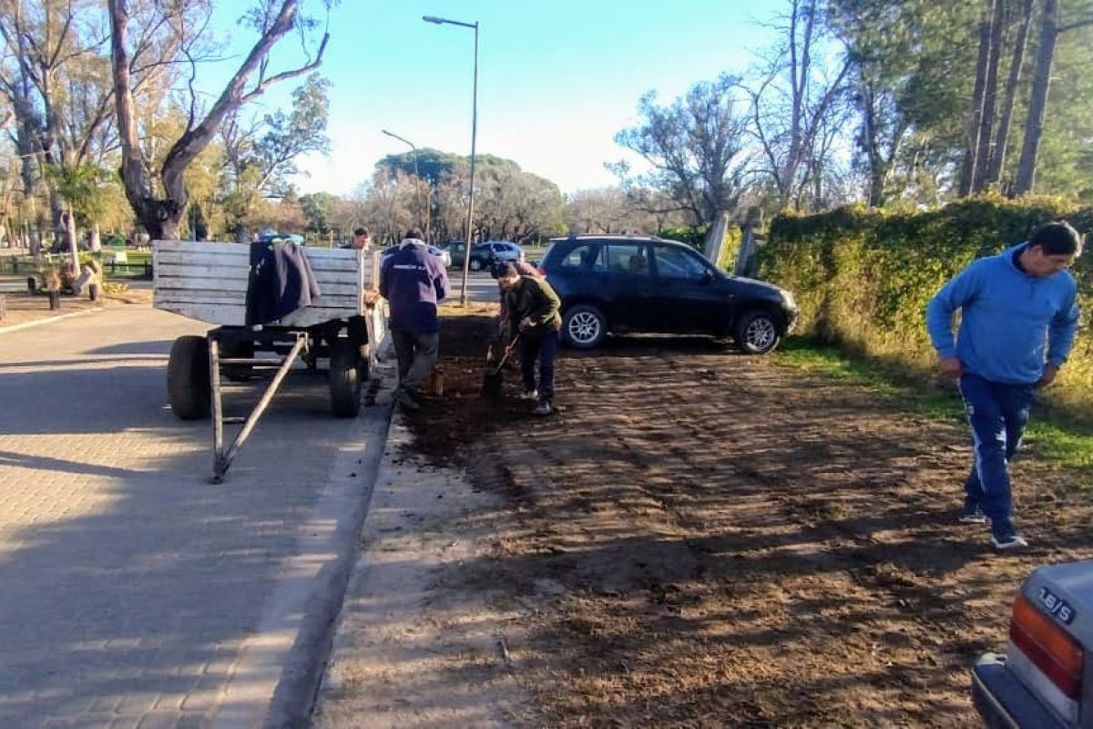 Personal municipal realizó tareas de limpieza, rastrillaje y relleno con tierra en el ingreso al tradicional sector del Parque Unzué, en el marco del mantenimiento permanente de los espacios verdes de la ciudad.