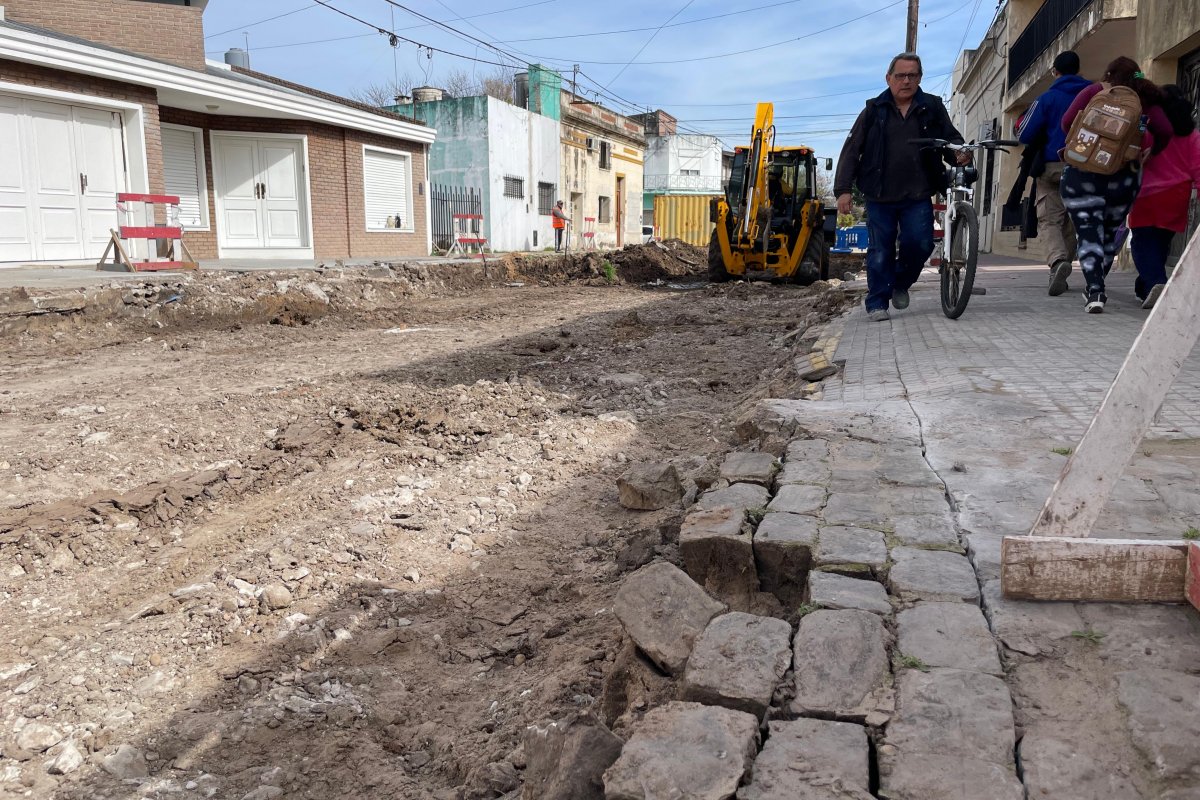 Luego de la primera etapa de los trabajos, durante la cual la cuadrilla de la Secretaría quitó los adoquines que estaban ubicados sobre el caño de agua que alimenta a los domicilios de esa cuadra, los que serán conservados para su uso futuro en estructuras ornamentales.