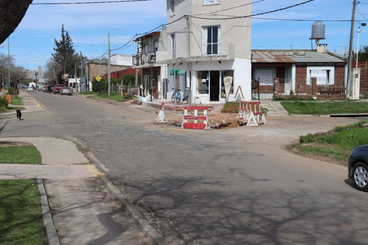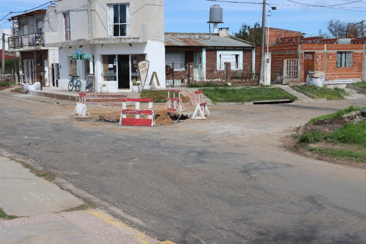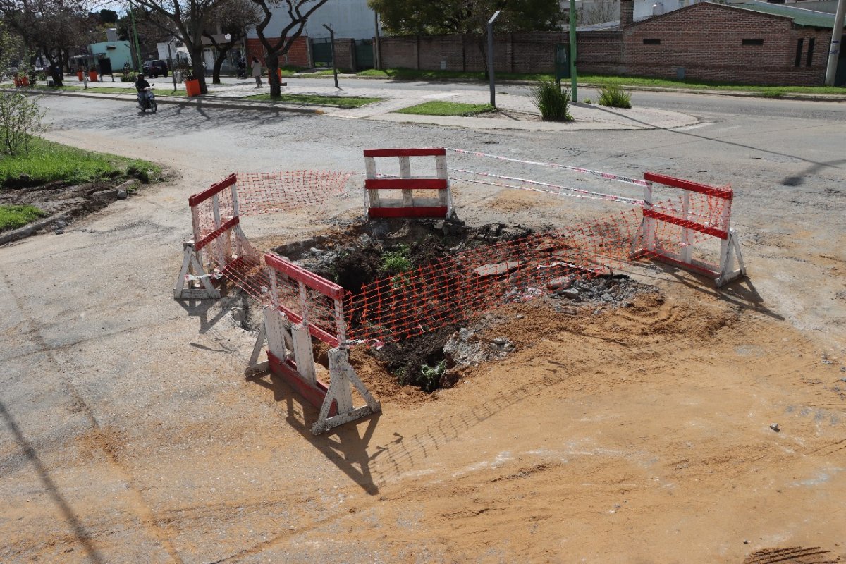 Debido a un socavón provocado por la rotura de una cloaca, personal de Obras Sanitarias y Obras Públicas intervino esa esquina para solucionar el problema. Mañana se rellenará con hormigón, que fraguará durante siete días.