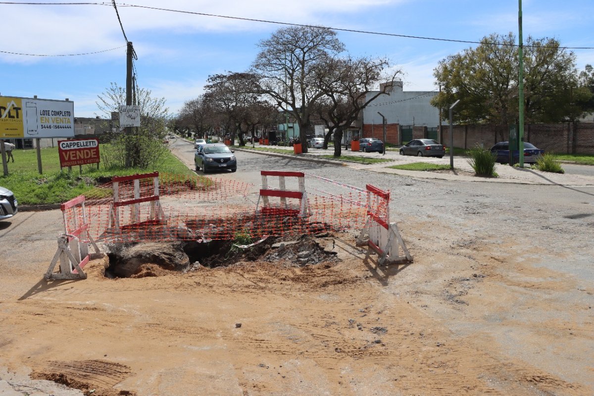 El inconveniente se originó tras las intensas lluvias de los últimos días, cuando se produjo un socavón en la calzada. Al abrir el pavimento, personal de la Dirección de Obras Públicas detectó que el suelo había sido erosionado tanto por el agua como por las pérdidas de una cañería cloacal que se encontraba dañada.