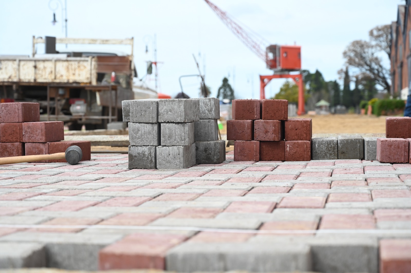En esta etapa ya comenzaron a colocarse los nuevos adoquines articulados luego de la remoción de los antiguos bloques que se encontraban en muy mal estado y dificultaban la circulación de peatones y vehículos. Con este recambio, la calzada recupera su funcionalidad y se garantiza una superficie más segura y uniforme.