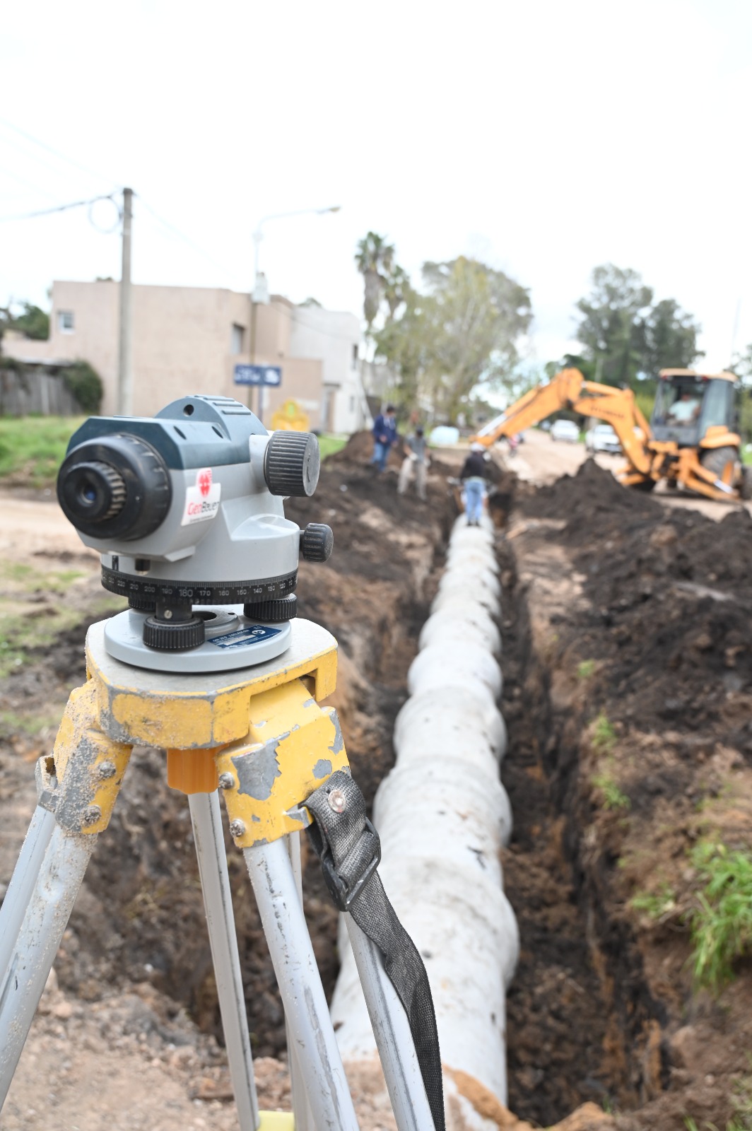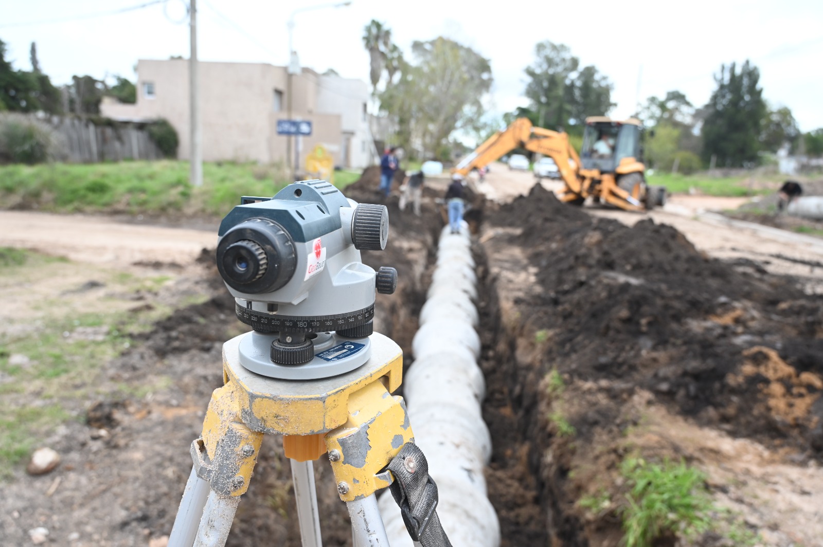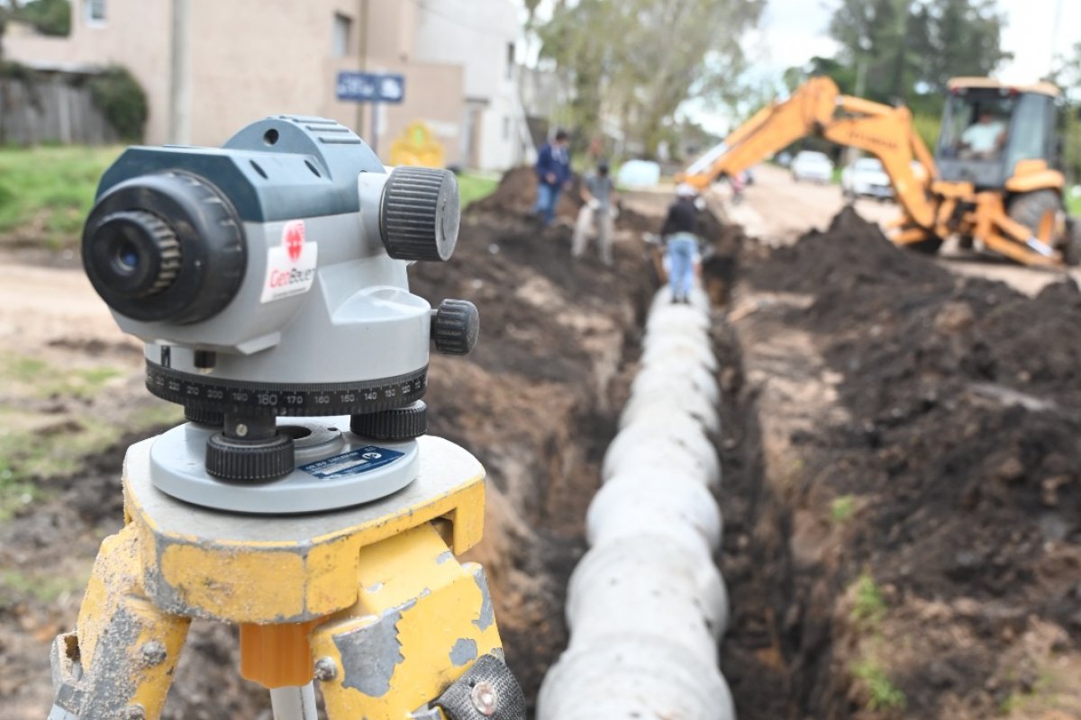 Los trabajos se ejecutan en la intersección de Gervasio Méndez y Mac Dougall, donde personal municipal y maquinaria especializada intervienen en la apertura de zanjas, nivelación y colocación de las piezas. Además de una cuadrilla con operarios municipales, también trabaja en el lugar una retroexcavadora que realiza las tareas de movimiento de suelo y manipulación de caños, mientras que el equipo técnico utiliza instrumentos topográficos para asegurar la pendiente adecuada y garantizar la eficiencia del sistema.