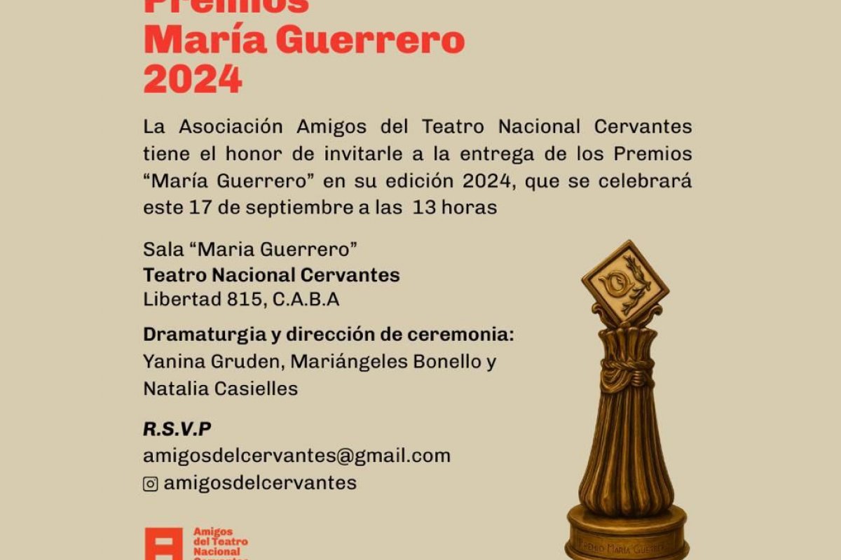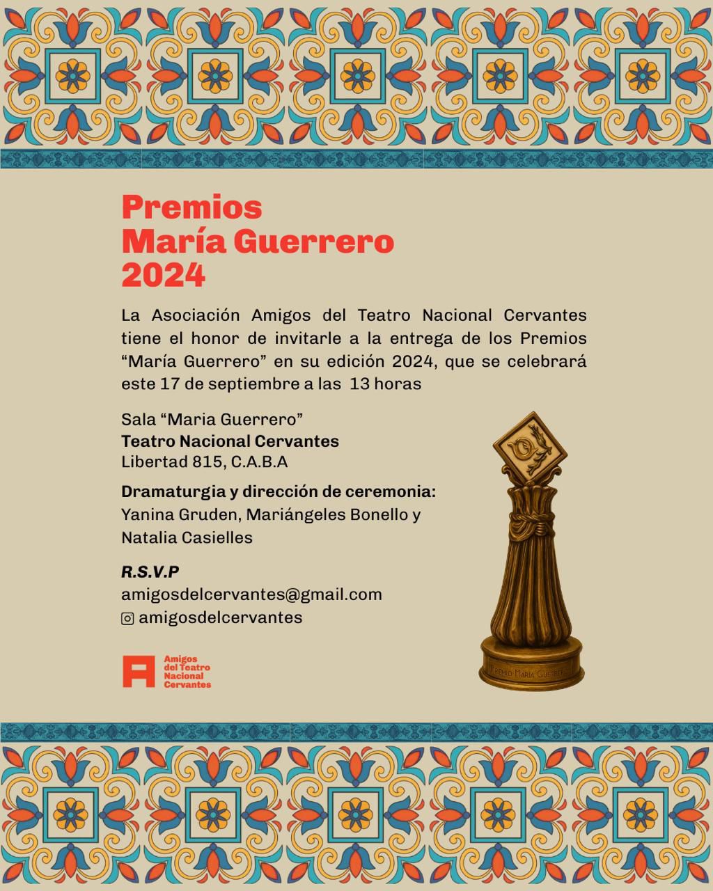 Los Premios María Guerrero se entregan cada año en la emblemática Sala María Guerrero del Teatro Nacional Cervantes, en Buenos Aires, y distinguen la excelencia en distintas áreas de la actividad teatral: actuación, dirección, escenografía, obra e instituciones. Organizados por la Asociación Amigos del Teatro Nacional Cervantes, rinden homenaje a la actriz española María Guerrero, figura clave en la historia del teatro argentino, y se han consolidado como una de las distinciones más valiosas del país.