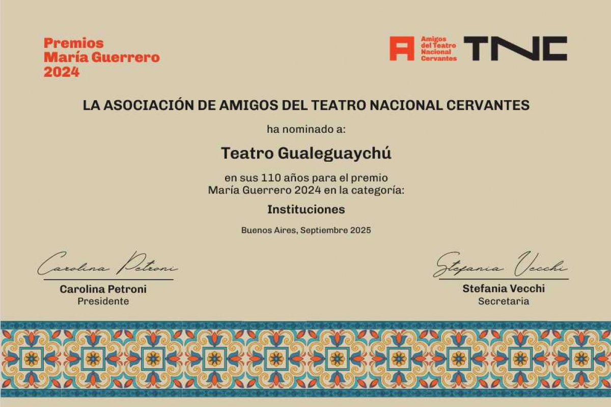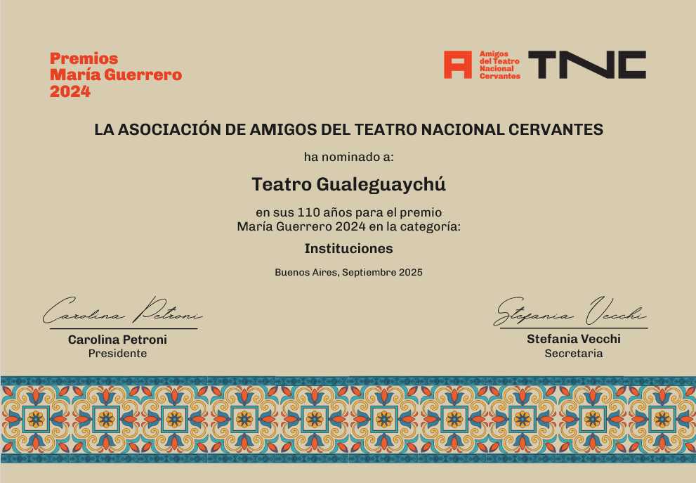 En el año de su 110° aniversario, el Teatro Gualeguaychú fue nominado en la categoría “Instituciones” de los prestigiosos Premios María Guerrero 2024, un reconocimiento que destaca su trayectoria y aporte cultural a la ciudad y la región.
