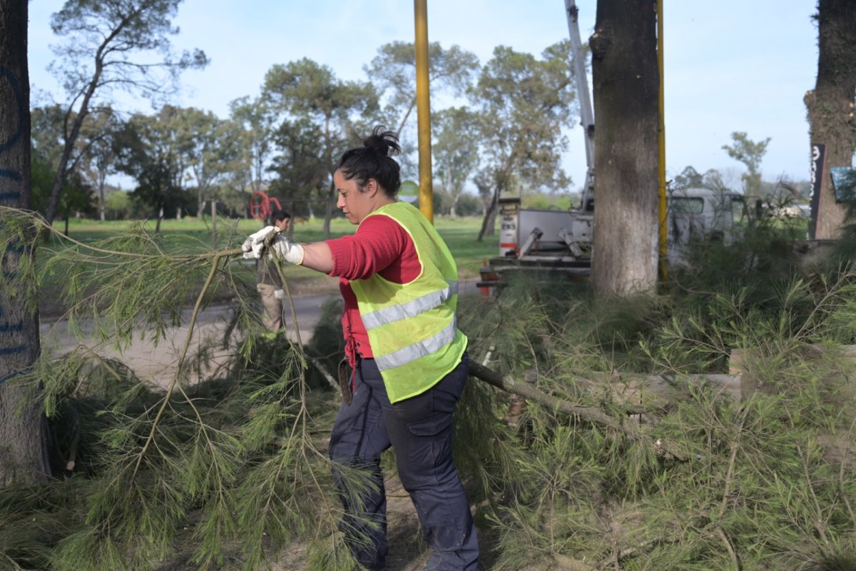 Personal de Espacios Verdes realizó poda y limpieza de casuarinas para mejorar la iluminación, reforzar la seguridad en los barrios aledaños al 338 y 348 y preparar la zona para próximas obras en calles y plazas.
