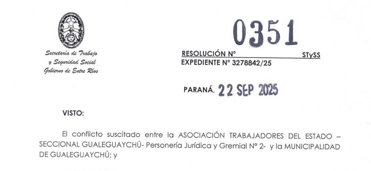 El Gobierno de Gualeguaychú informa que, mediante Resolución N°351/2025 de la Secretaría de Trabajo y Seguridad Social de Entre Ríos, se resolvió declarar ilegal la medida de acción directa que había sido iniciada por la Asociación Trabajadores del Estado (ATE) el 17 de septiembre de 2025, y que actualmente está vigente en el ámbito municipal por tiempo indeterminado.