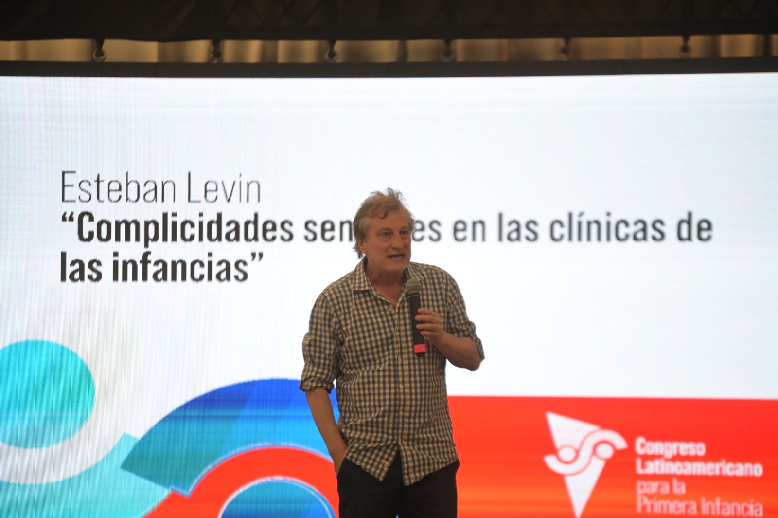 Seguidamente, se destacó la disertación de Esteban Levin, psicólogo, psicomotricista y psicoanalista, cuya presencia era esperada y valorada por los participantes del congreso. Levin presentó la primera parte de su exposición “Complicidades sensibles en las clínicas de las infancias”, resaltando la relevancia de la dimensión corporal, emocional y lúdica en los vínculos que sostienen los procesos de cuidado y aprendizaje. Posteriormente, continuó con la segunda parte de su disertación, en la que presentó su más reciente libro “Complicidades sensibles en las clínicas de las infancias. La imagen del cuerpo en el juego” (2025), como aporte teórico y práctico al campo de la educación y la salud infantil.