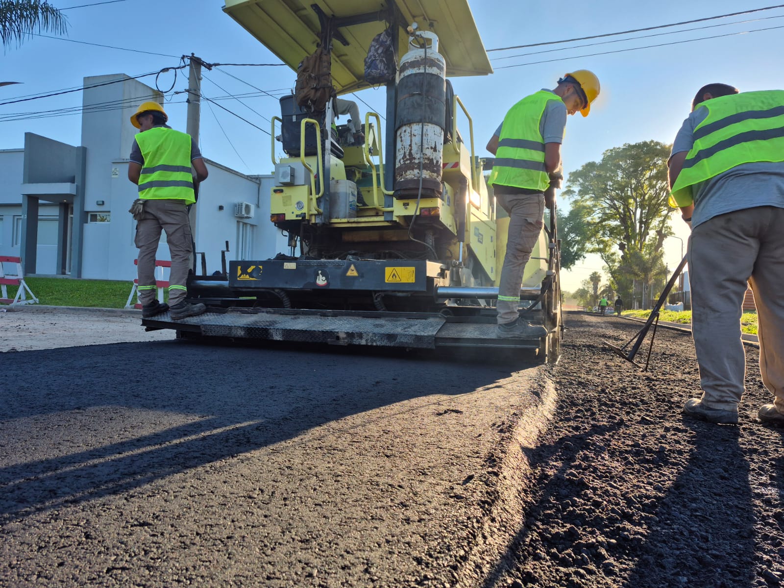 El proceso de pavimentación comenzó cuando los camiones con la mezcla llegaron al lugar y depositaron la carga directamente sobre la primera maquinaria, denominada terminadora, que distribuye uniformemente la mezcla asfáltica sobre la mitad de la calzada y le otorga aproximadamente el 85% de su compactación final.