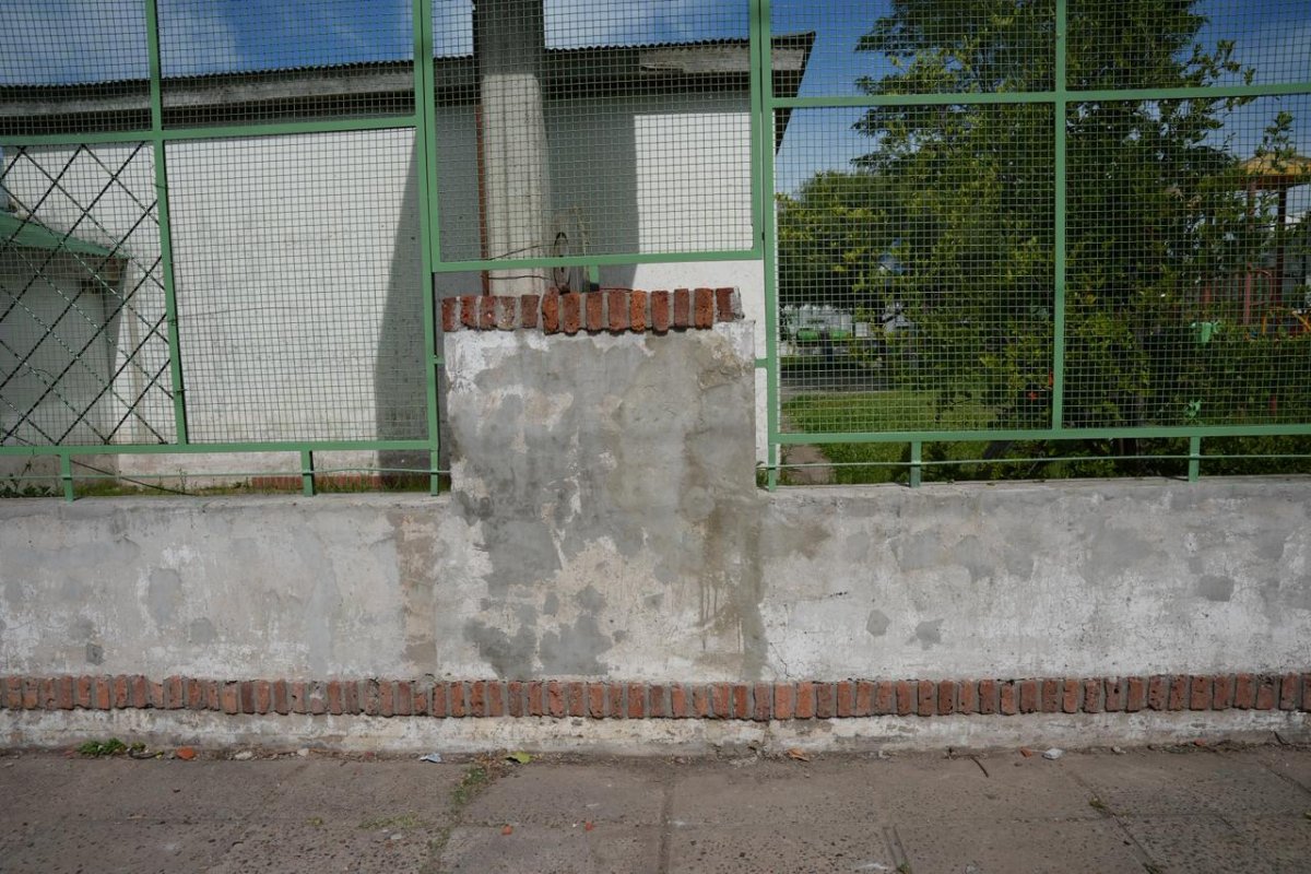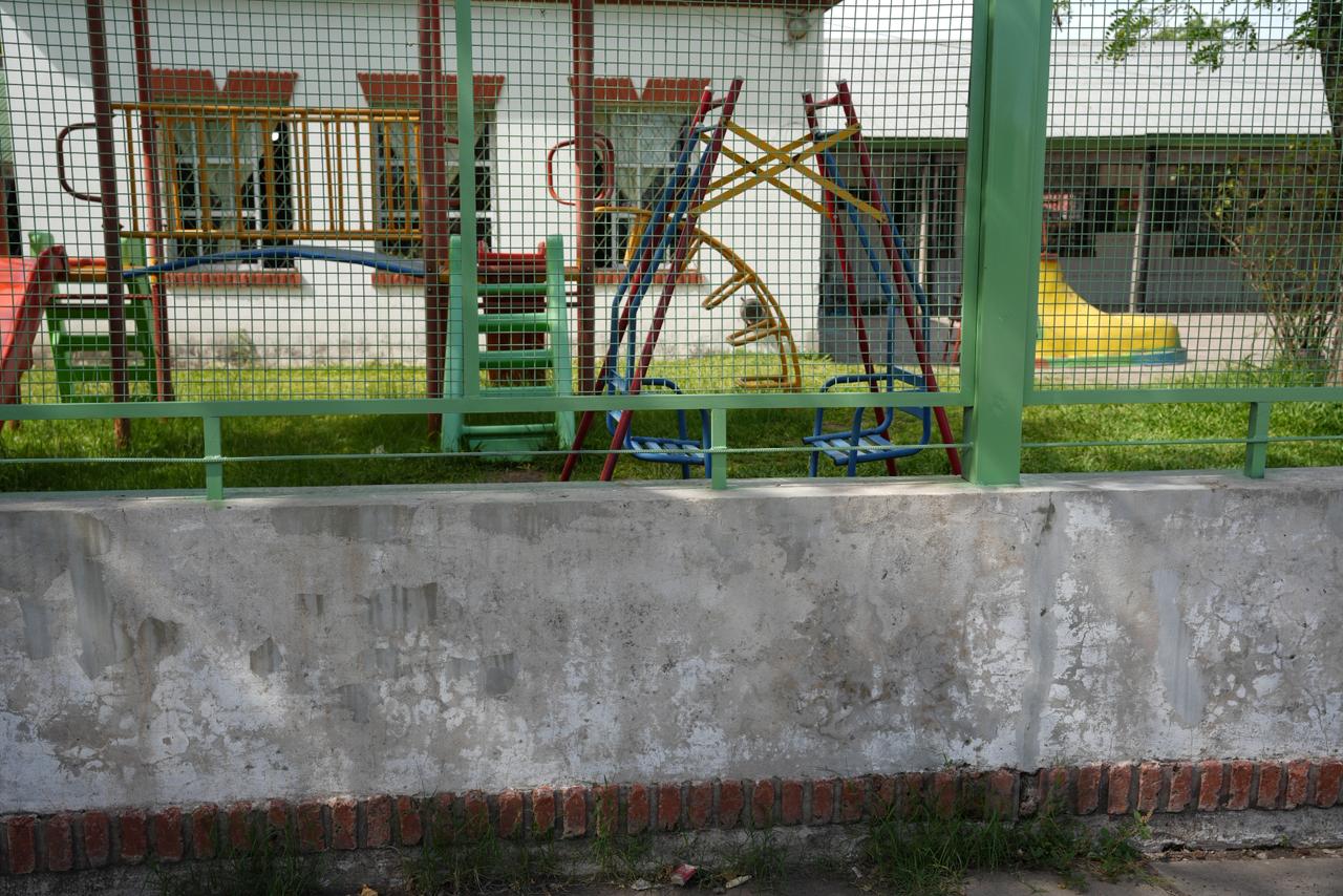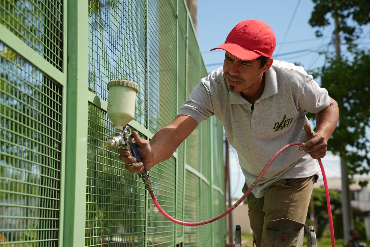 El frente del establecimiento cuenta con una pared dos alturas diferentes y encima una reja con malla sima fina, que se lavó para quitar hongos y se lijó en profundidad. Actualmente, la estructura recibe pintura de color verde para reforzar su protección y renovar la estética del ingreso.