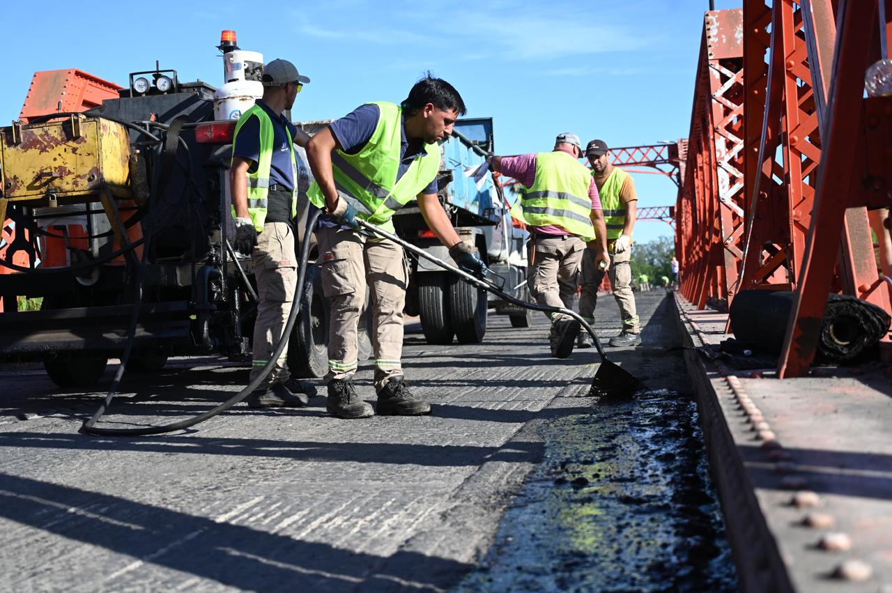 La intervención incluyó tareas adicionales sobre los laterales metálicos, donde el personal ajustó bordes y repasó sectores con material asfáltico para consolidar el sellado. Con esta instancia completada, la estructura queda lista para recibir el nuevo asfalto, que sellará el proceso de restauración y devolverá al puente su capacidad plena de servicio.