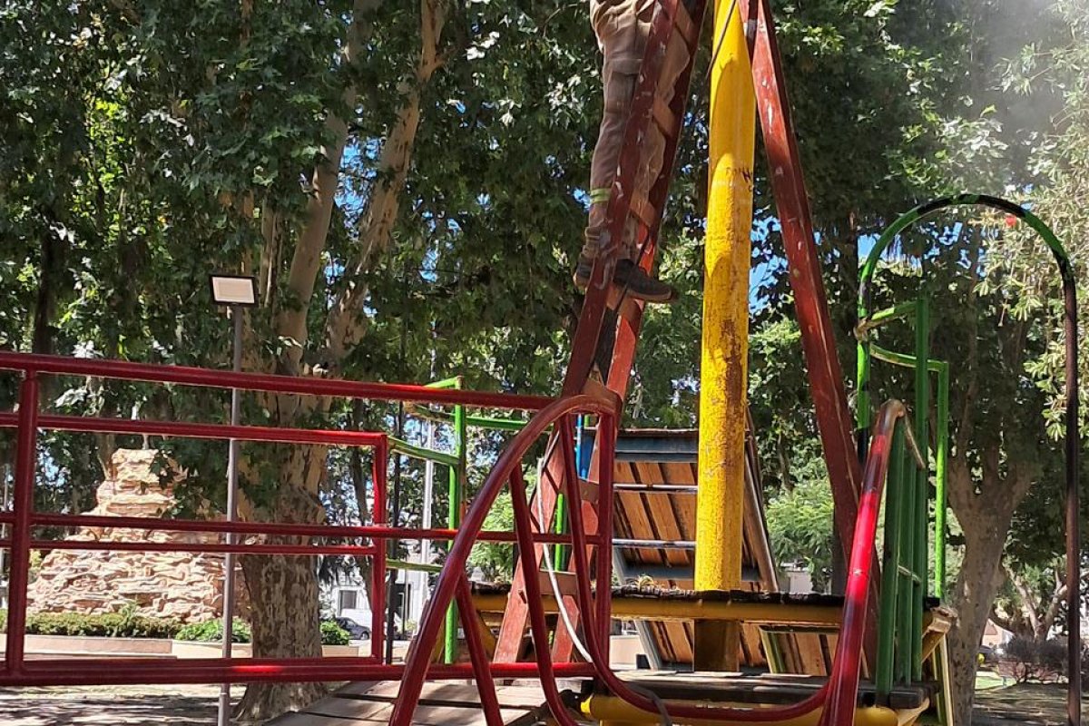 En paralelo, se realizan acciones de mantenimiento sobre los juegos destinados a los niños, uno de los puntos de mayor concurrencia dentro de la plaza. Las tareas incluyen limpieza integral, revisión de anclajes y acondicionamiento general de las estructuras, con el propósito de garantizar entornos seguros y funcionales para el esparcimiento.