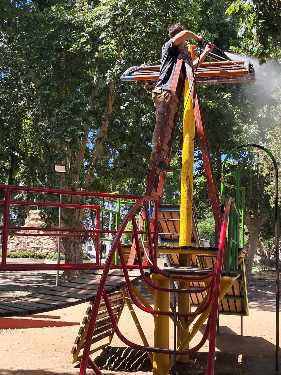 Esta intervención alcanza pérgolas, barandas, juegos infantiles y sectores de apoyo, lo que permite recuperar color, textura y condiciones adecuadas para el uso público.