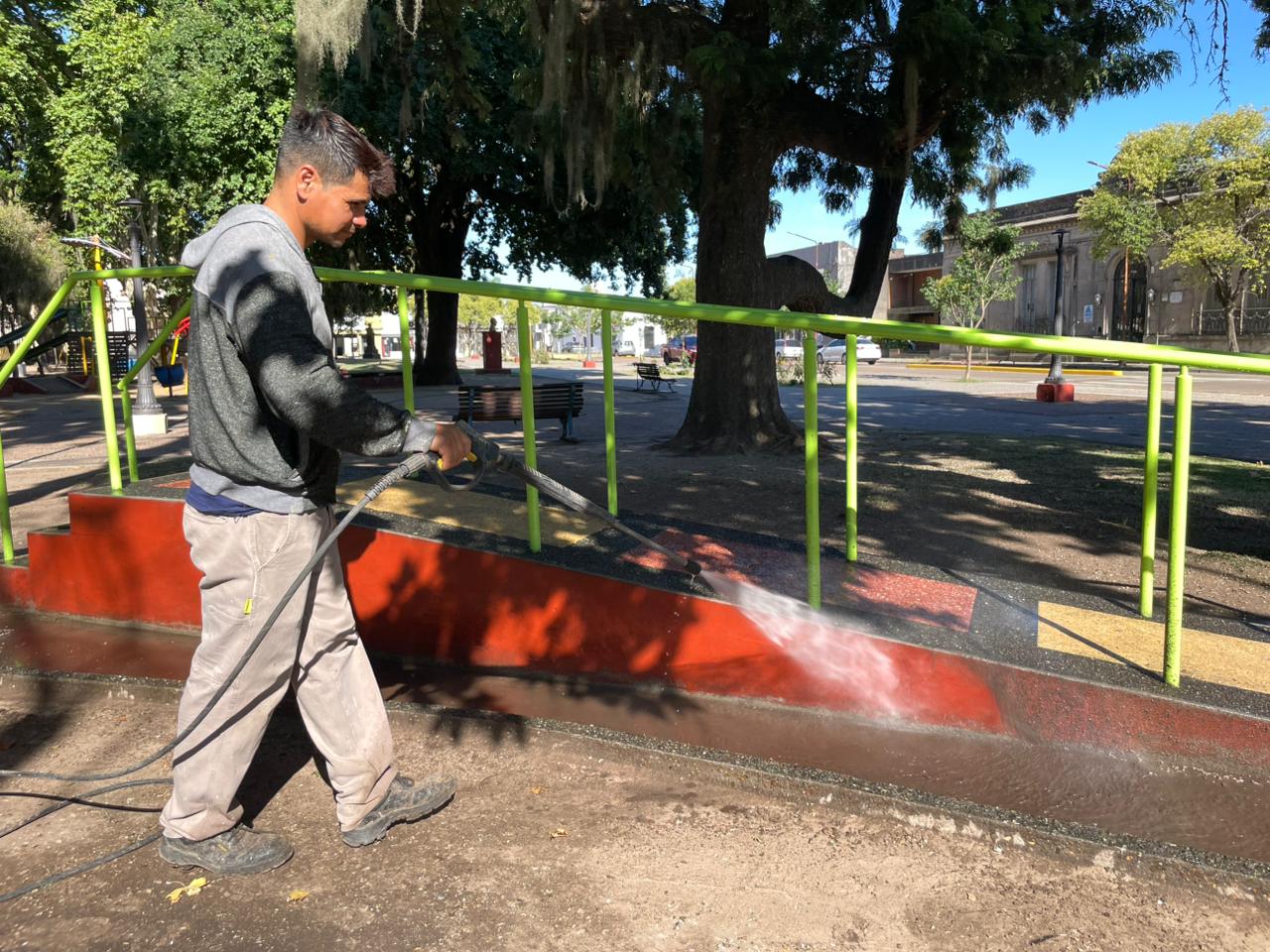 Además de una limpieza integral, se realiza el hidrolavado de los juegos y el mobiliario del espacio público. En los próximos días comenzarán los trabajos para volver a poner en funcionamiento la fuente ubicada frente a la Jefatura Departamental.