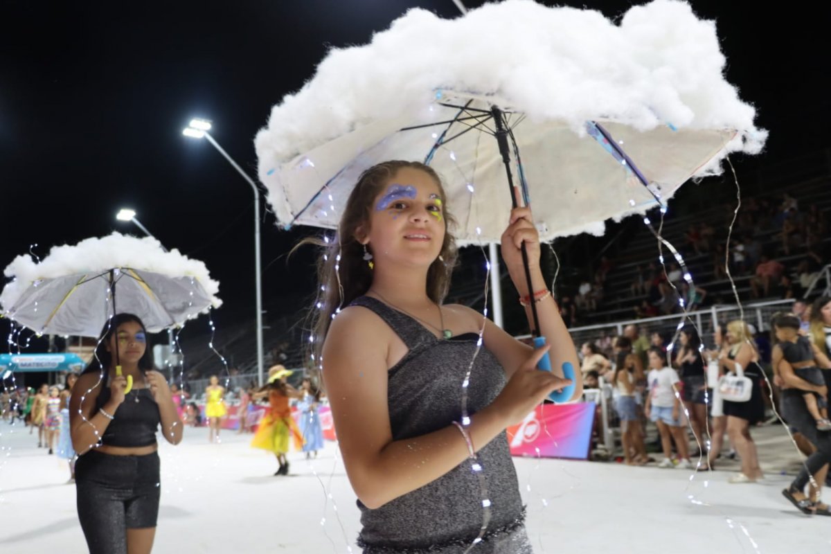 La noche comenzó con el desfile infantil, donde la imaginación y el entusiasmo de los más pequeños se destacaron en la pasarela, acompañados por el apoyo de padres, familiares y profesores. En esta instancia se presentó la murga infantil del Club Deportivo Juventud Unida "Rugido del Oeste", donde el "León de la Vía" volvió al corso con un tren lleno de sonrisas: leoncitos, vías, maquinistas y vagones avanzaron entre papelitos y colores, compartiendo la fiesta del Oeste. También participaron Los Jaguarcitos del Tiro, quienes presentaron “Viaje al Arcoíris”, una colorida propuesta protagonizada por alrededor de 70 niños y niñas de hasta 12 años, con personajes divertidos y una cuidada puesta en escena.