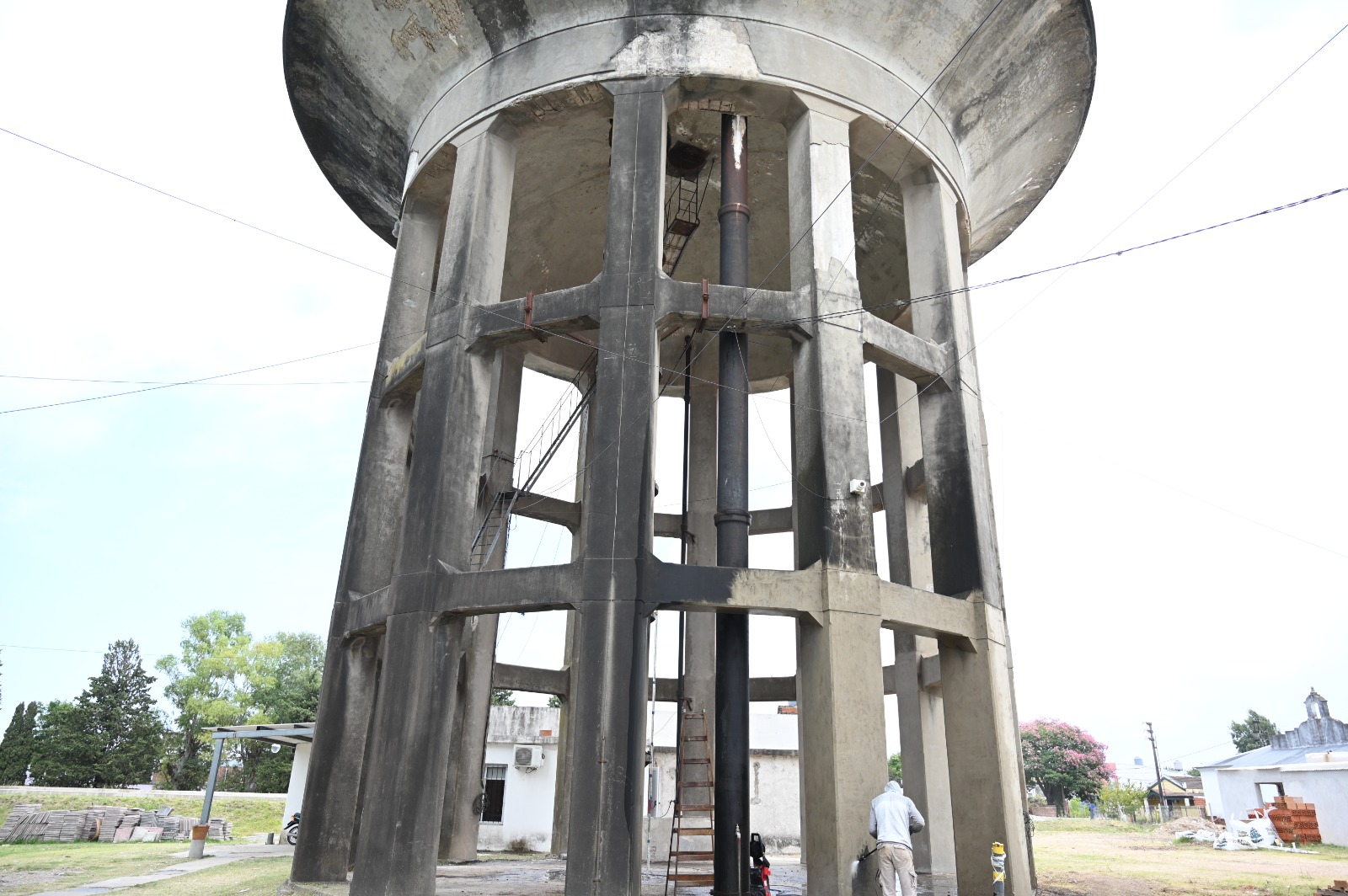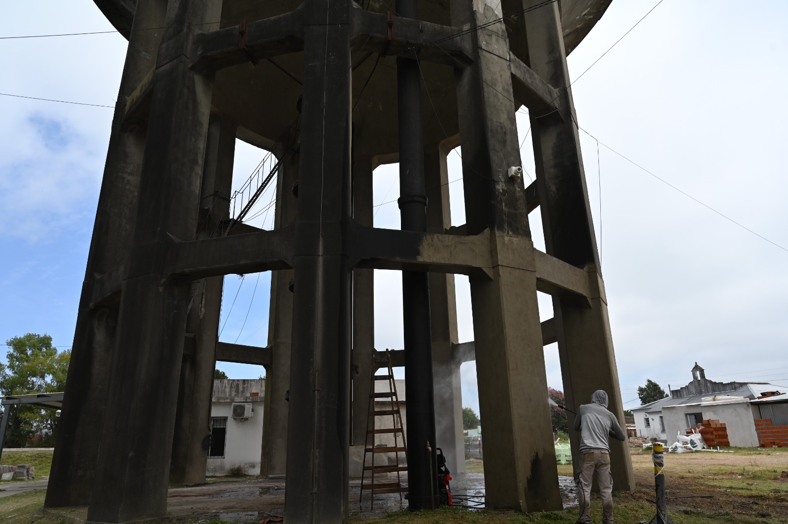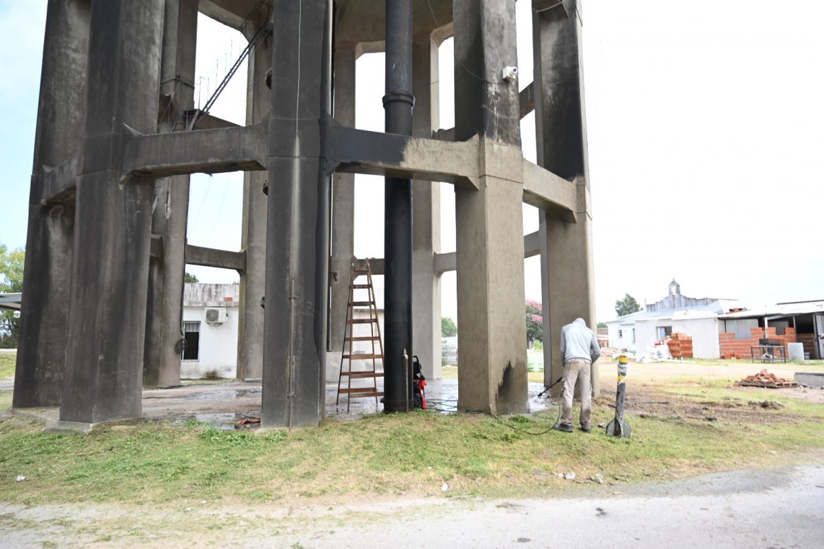 Las tareas actuales se concentran en la limpieza profunda de la base, que está compuesta por doce columnas que sostienen una cuba maciza. Las mismas son sometidas a la limpieza de la superficie exterior mediante hidrolavado, una técnica que permite remover suciedad adherida desde hace años, además de líquenes y hongos que habían colonizado amplios sectores del material.