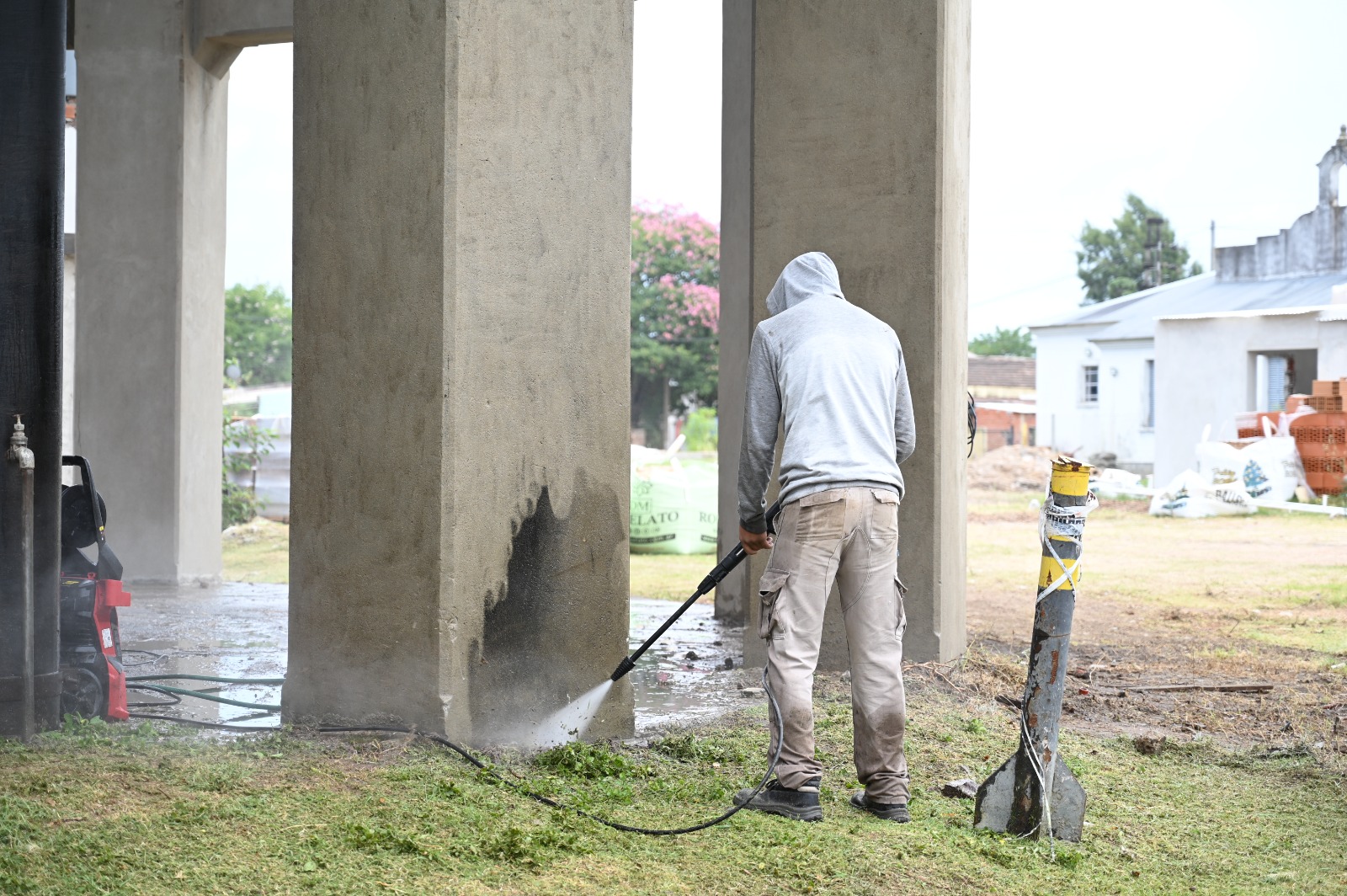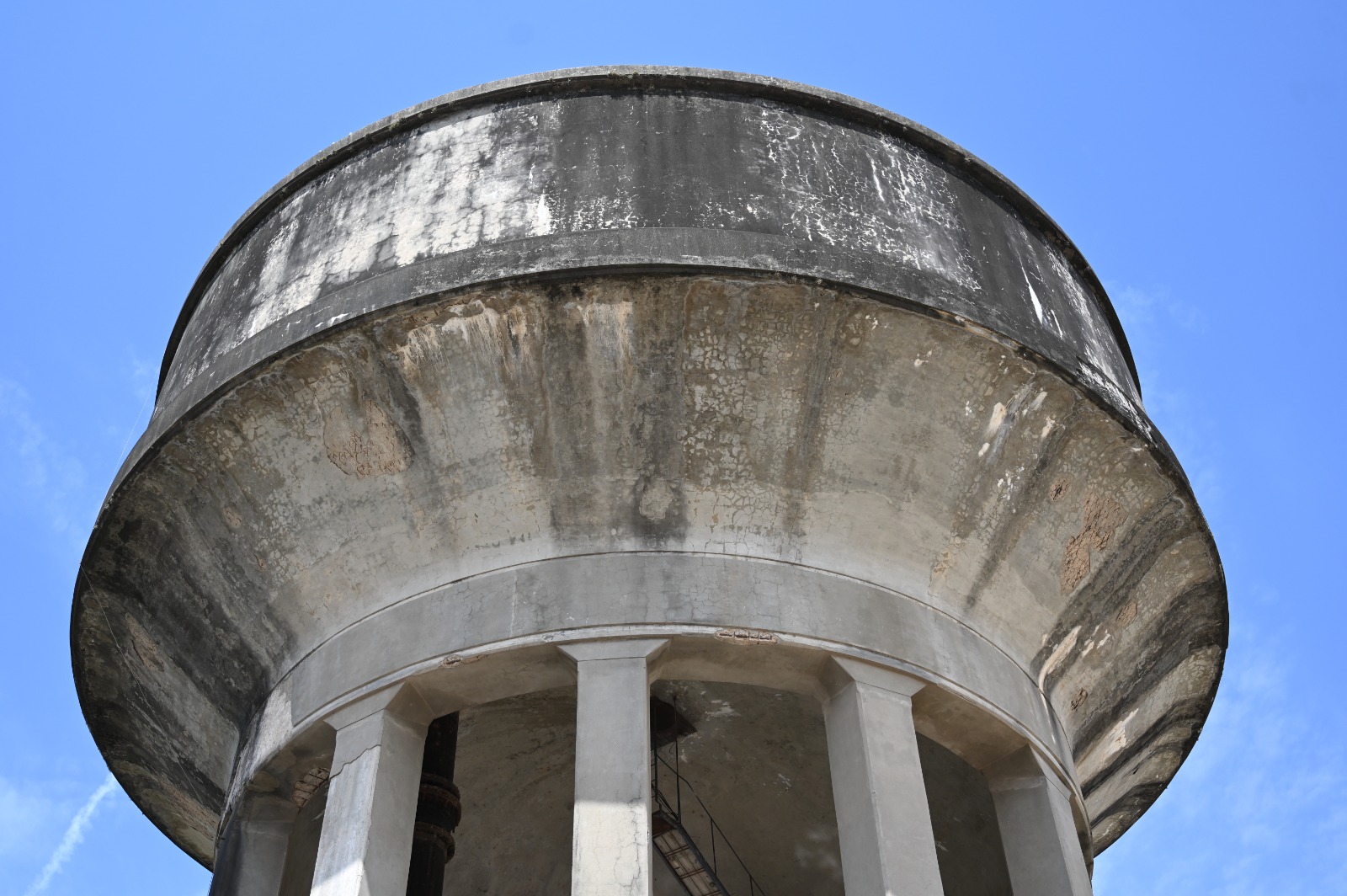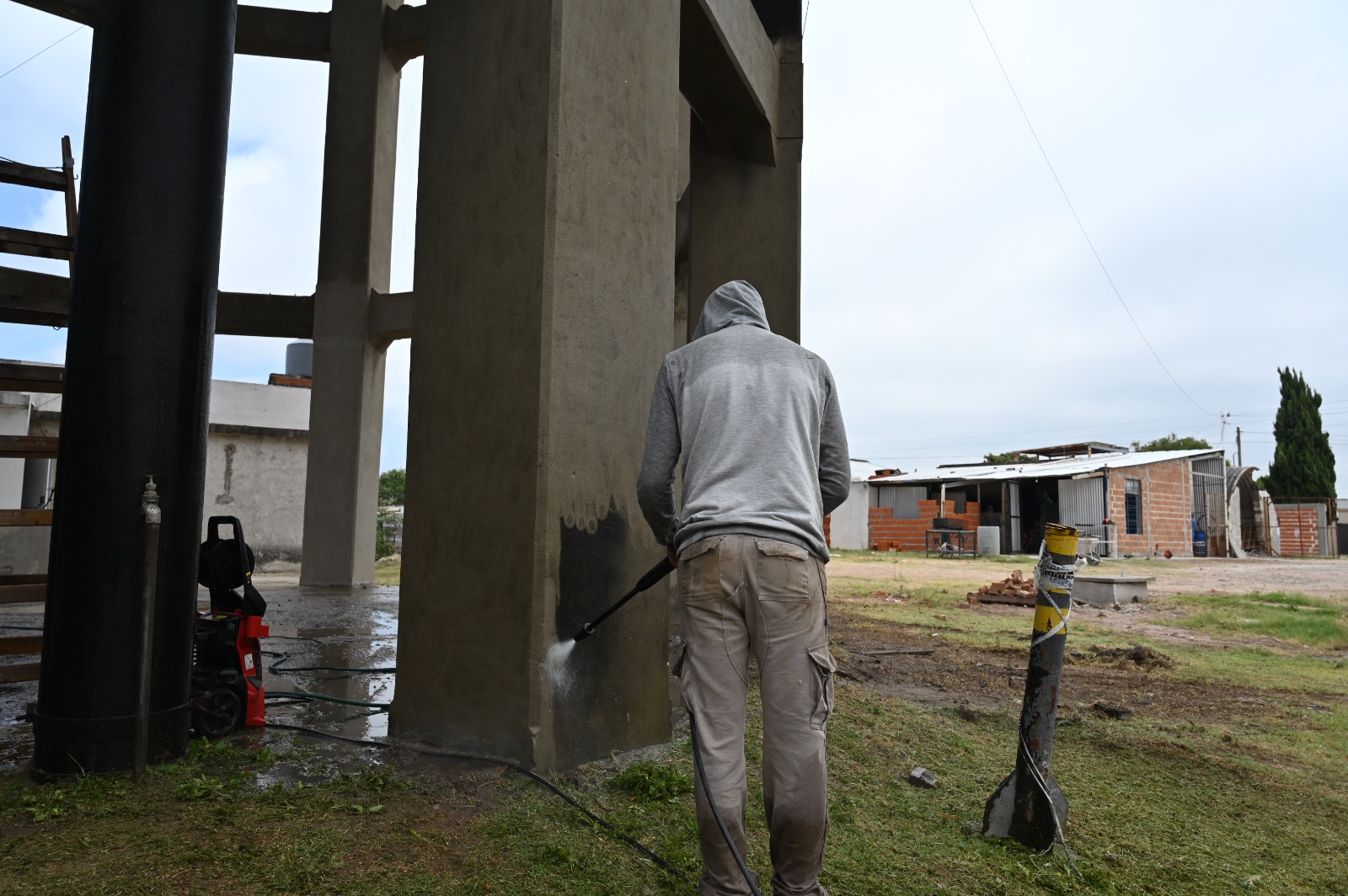 Las tareas actuales se concentran en la limpieza profunda de la base, que está compuesta por doce columnas que sostienen una cuba maciza. Las mismas son sometidas a la limpieza de la superficie exterior mediante hidrolavado, una técnica que permite remover suciedad adherida desde hace años, además de líquenes y hongos que habían colonizado amplios sectores del material.