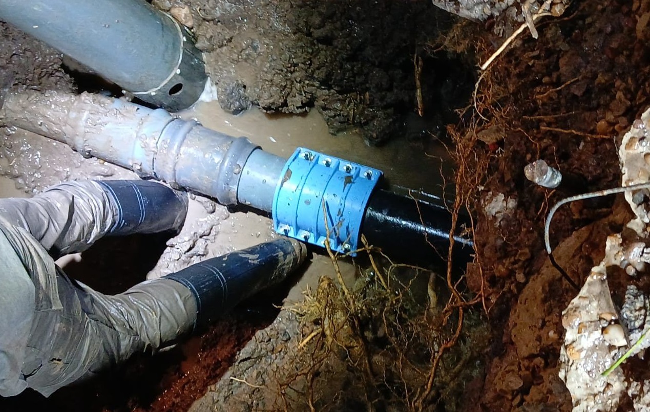 Una vez expuesto el tramo comprometido, la cuadrilla limpió la superficie y colocó una junta metálica de ajuste que abraza el cilindro en el punto dañado. El dispositivo cuenta con bulones laterales que, al ajustarse, ejercen presión mediante una goma interna que sella la filtración. Esta técnica evita reemplazos extensos y permite restituir el servicio con eficiencia y precisión.