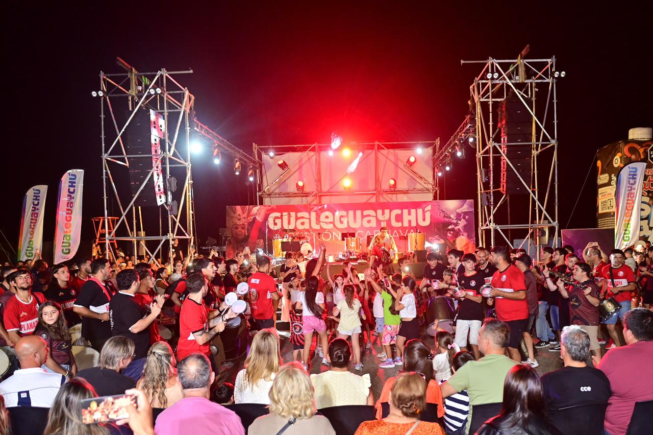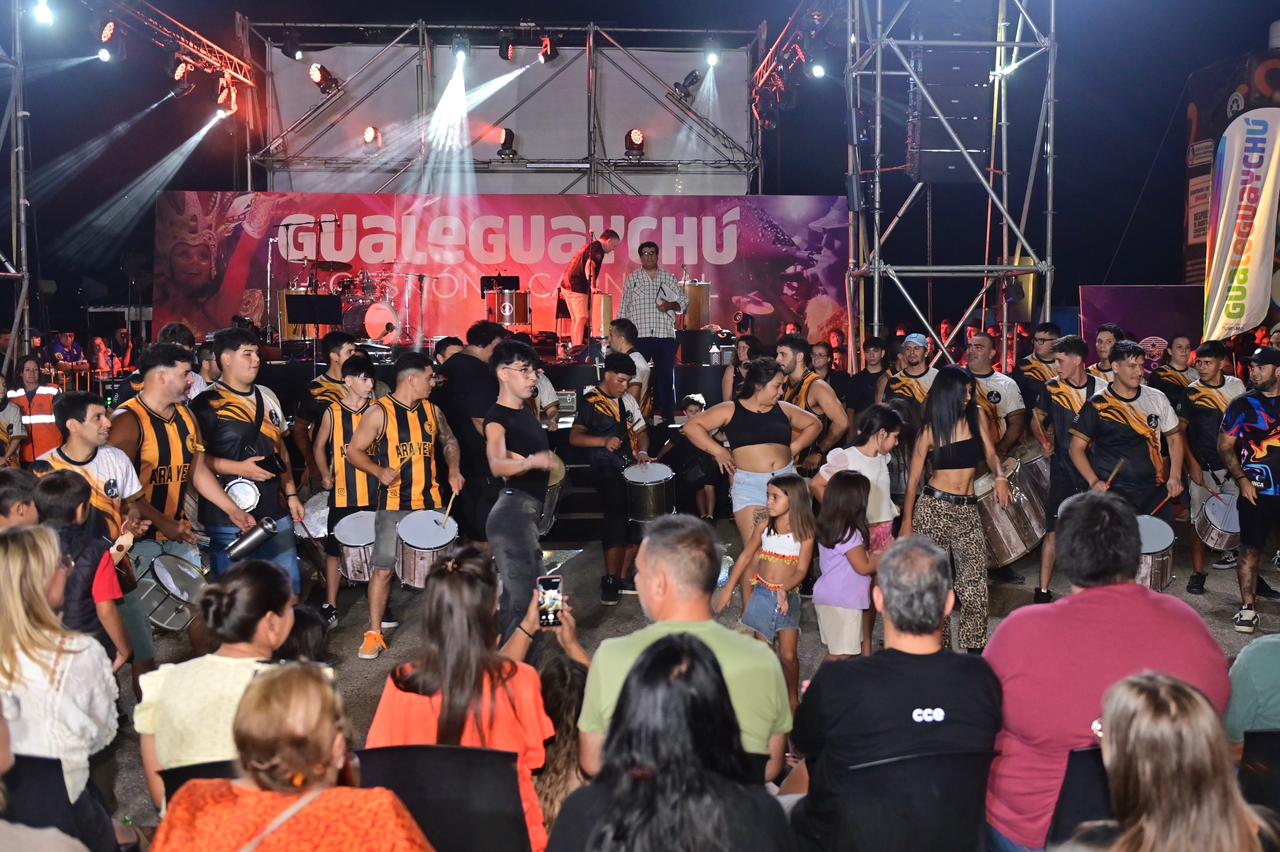 La apertura estuvo a cargo de la Batucada Los Pibes; luego fue el turno de Las Audaces; más tarde se presentó Batería Aplanadora y el cierre lo realizó Sonido de Parche. Las pasistas invitadas, Martina Ghiglia y Rosario Sánchez, junto a pasistas de la comparsa Amancay de Urdinarrain, aportaron brillo y cercanía, bailando junto a decenas de niños que imitaban cada movimiento a pocos metros del escenario, mientras Toque de Samba hizo cantar al público con cada una de sus canciones.