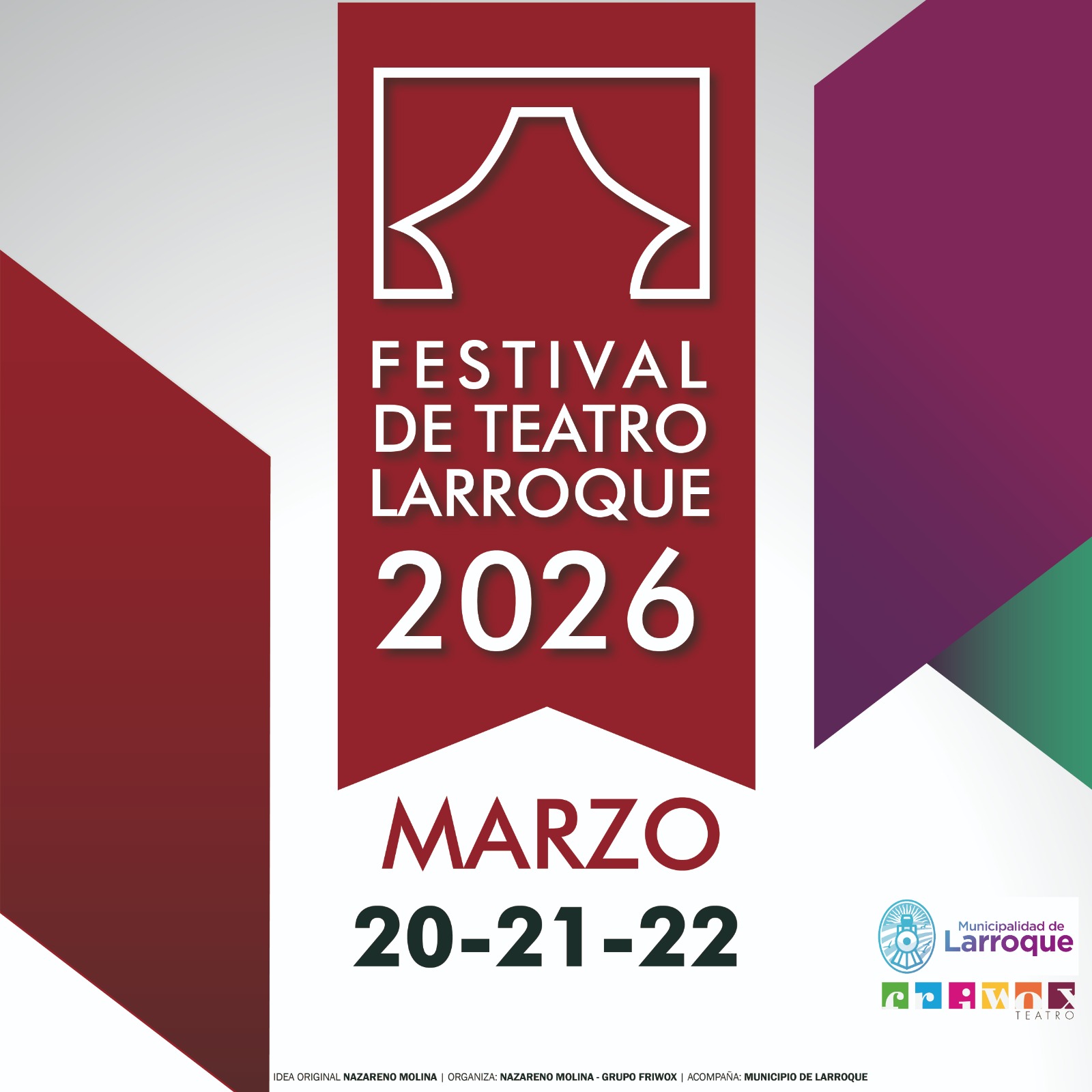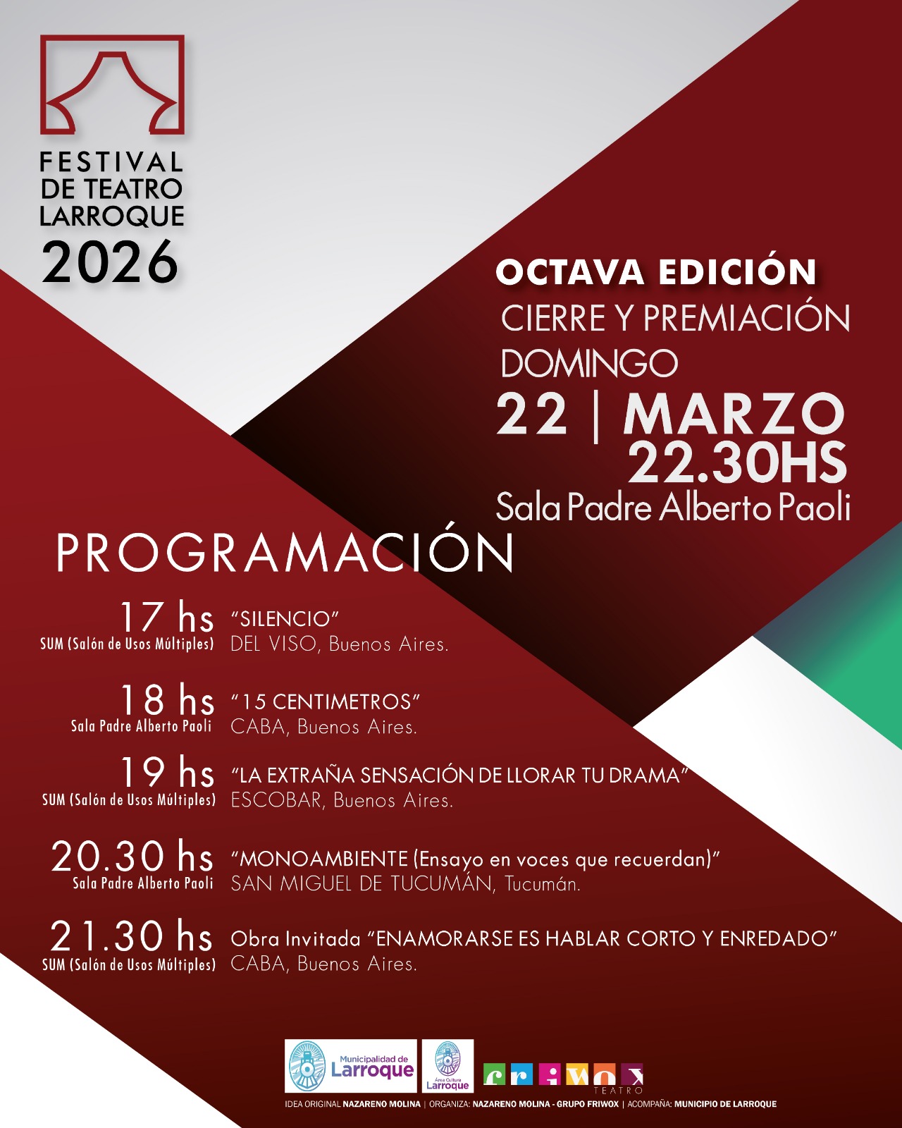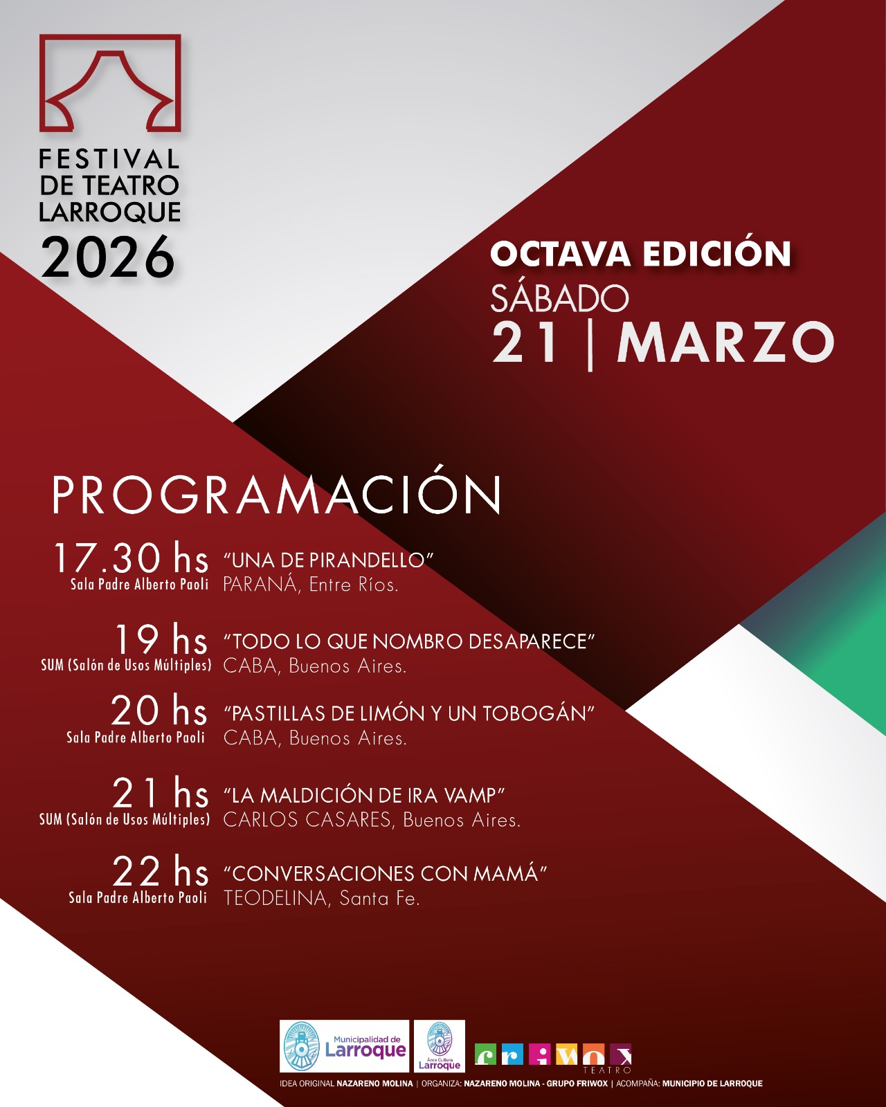 Después de siete exitosas ediciones, de gran repercusión a nivel nacional, llega el "VIII Festival de Teatro de Larroque 2026" con gran expectativa y una variada y versátil programación. El mismo se realizará en dos salas alternativas: Sala Padre Alberto Paoli y Salón de Usos Múltiples en la ciudad de Larroque, Departamento Gualeguaychú en la provincia de Entre Ríos.