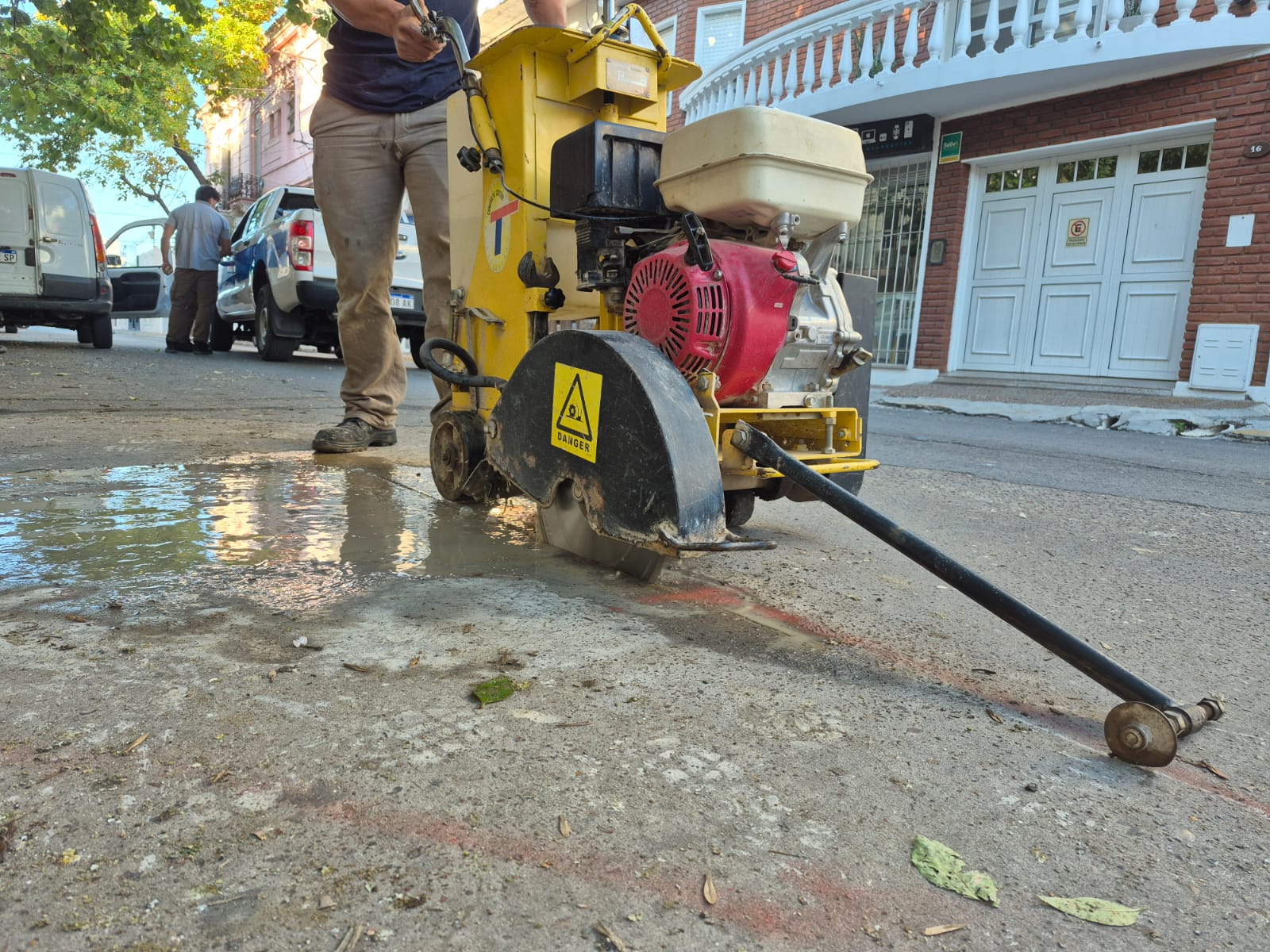 El miércoles por la mañana se dio inicio a las tareas con el corte controlado de la calzada mediante maquinaria específica para seccionamiento de hormigón, lo que posibilitó delimitar con exactitud el área de excavación y reducir el impacto sobre la circulación vehicular y peatonal.
