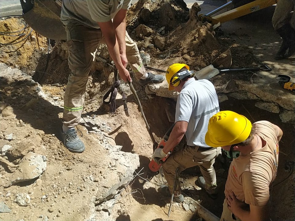 La intervención demandó la utilización de equipamiento específico, que incluyó cortadoras de pavimento con disco diamantado para apertura de calzada, martillos neumáticos para la remoción de material consolidado, retroexcavadoras para la extracción de suelo y herramientas manuales para tareas de precisión en sectores de difícil acceso.