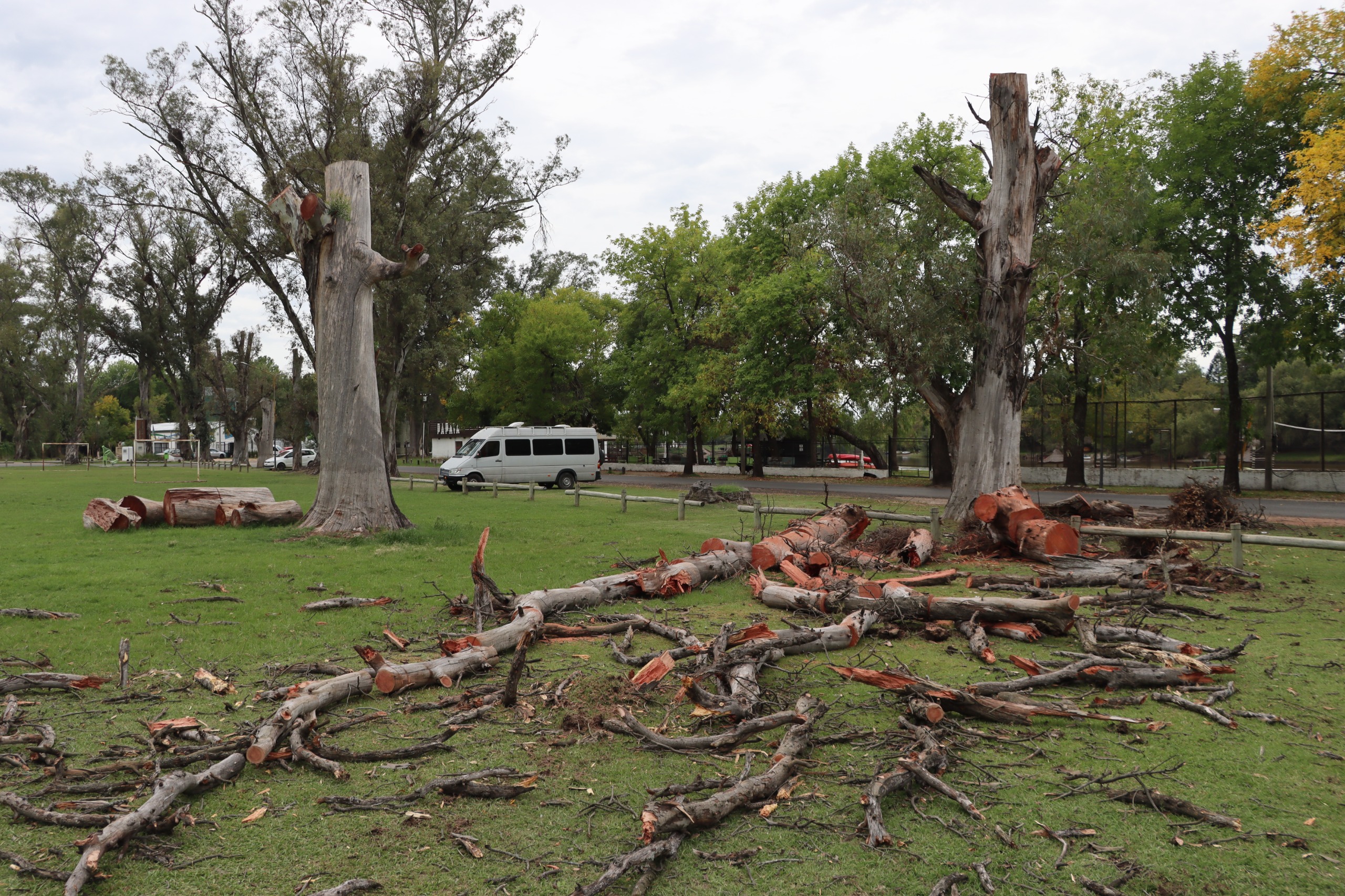En los casos de árboles sin vitalidad, se aplicaron cortes planificados que redujeron su altura a un rango de entre cuatro y cinco metros. Esta decisión eliminó la posibilidad de vuelcos o desprendimientos de gran porte y, al mismo tiempo, habilitó una etapa futura de valorización mediante trabajos de tallado en articulación con el área de Cultura.