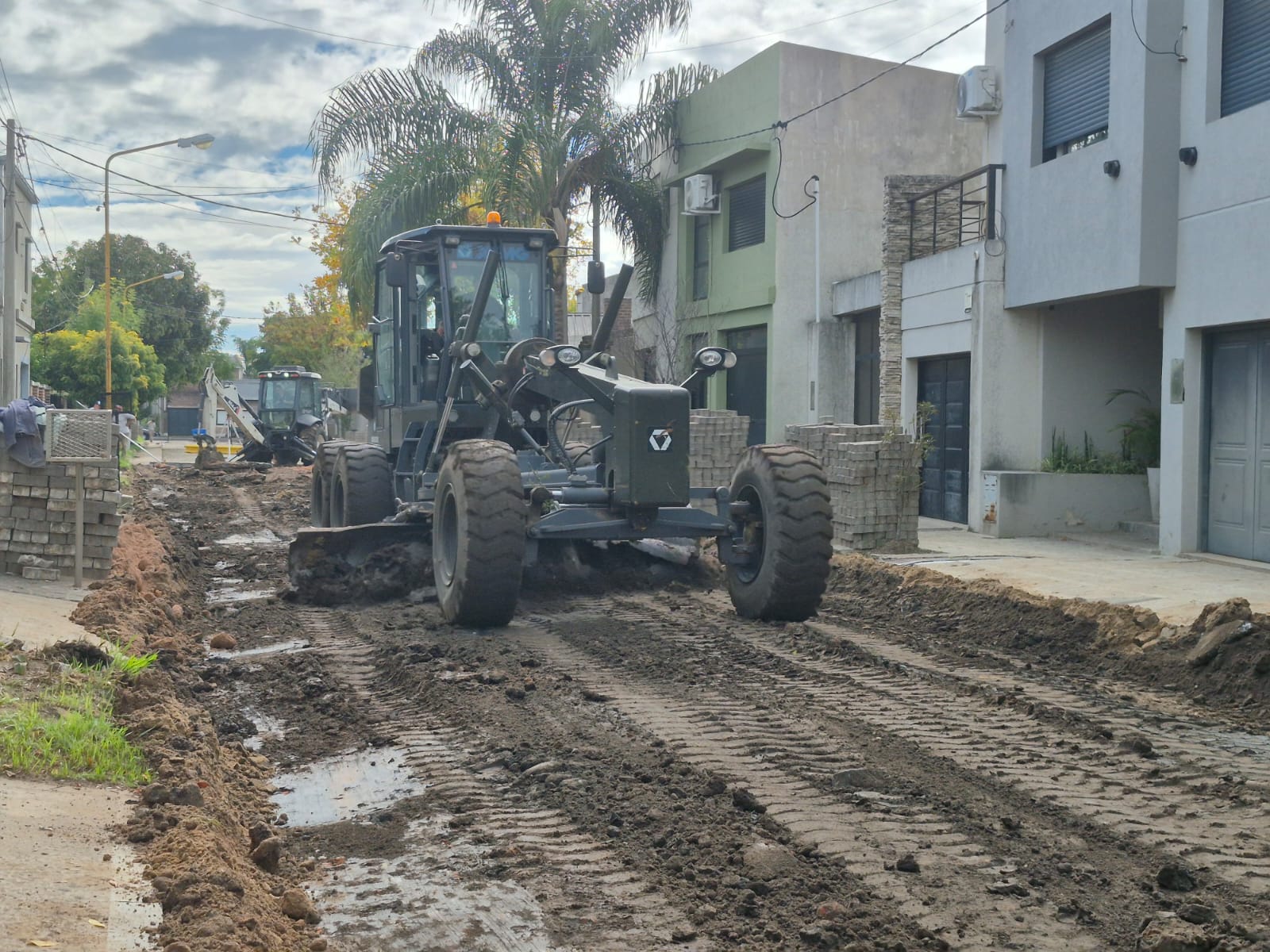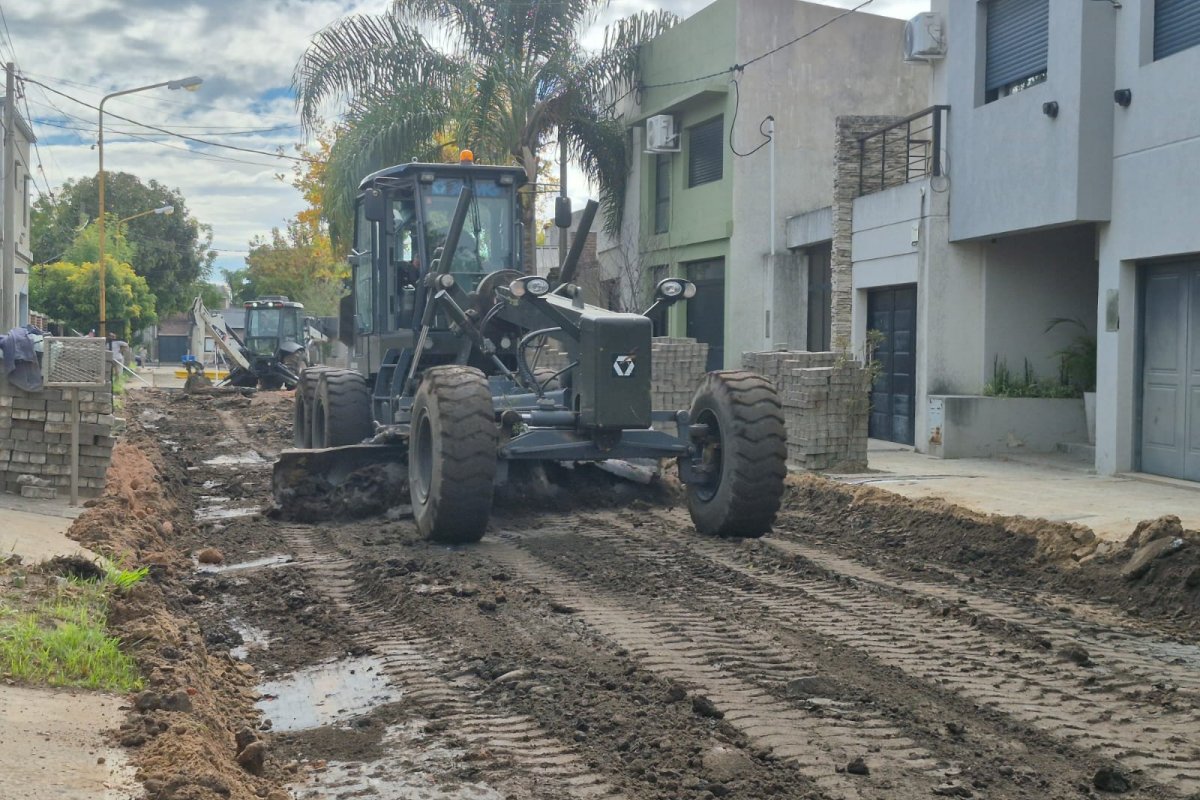 Con la base de tierra de la calle en tierra al descubierto, los equipos —entre ellos una motoniveladora y una retro— procedieron a la consolidación de la subrasante con cemento en los sectores de mayor fragilidad, una intervención que garantiza que el nuevo paquete estructural tenga una base firme y homogénea sobre la cual trabajar.