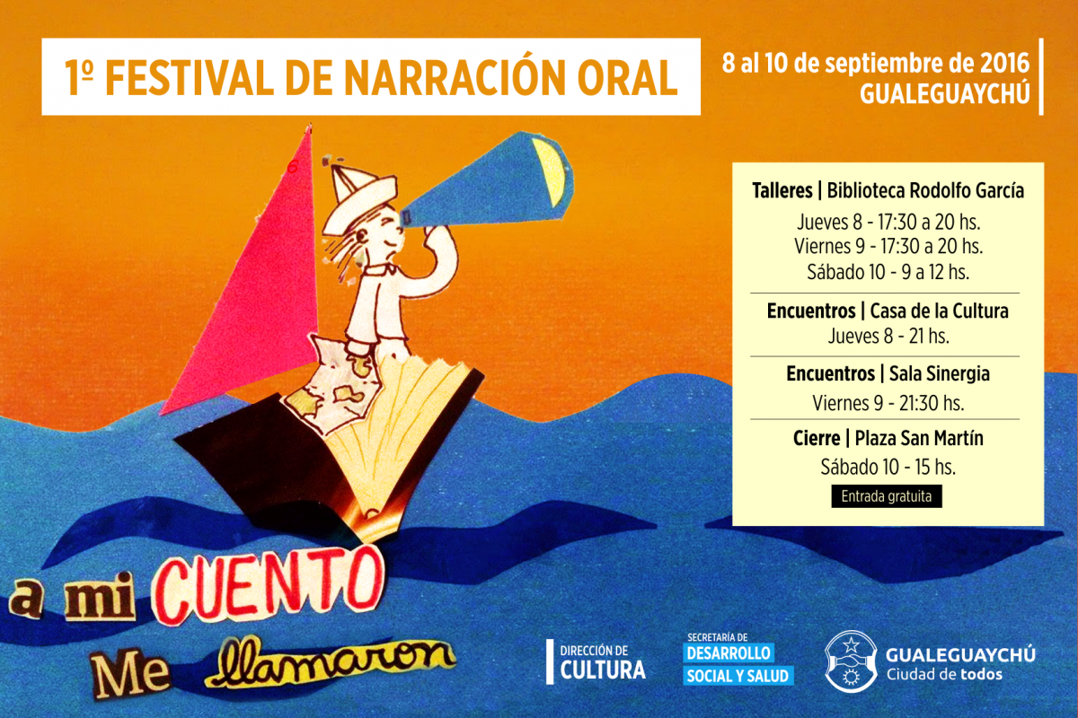 La Dirección de Cultura y la Dirección de Educación Popular, junto a UADER y su Profesorado de Teatro, DRAMATIZA Red Nacional de Profesores de Teatro, AINCRIT asociación de Investigación y crítica teatral, SOL Y GRANA, gestión y recursos educativos y las Bibliotecas Populares de la ciudad y Grupos de Teatro Independiente, invitan a participar del 1º Festival de Narración Oral: "A mi cuento me llamron", a desarrollarse del 8 al 10 de Septiembre.