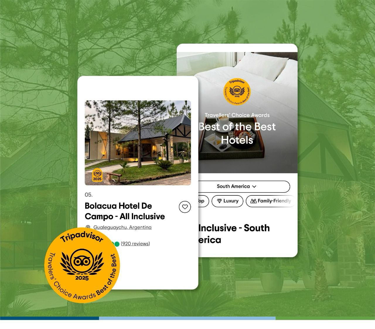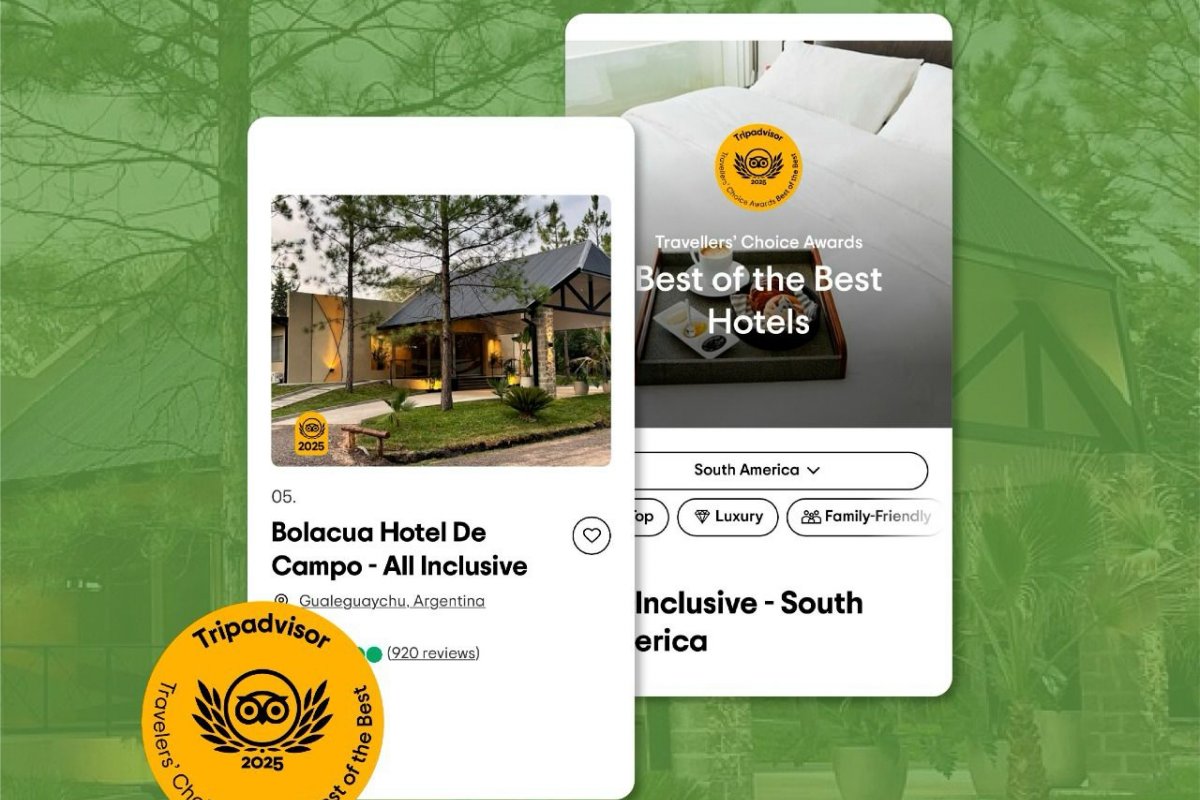 Ubicado en Gualeguaychú, Bolacuá All Inclusive fue distinguido por cuarto año consecutivo con el premio Travellers' Choice Best of the Best de Tripadvisor, posicionándose entre los cinco mejores hoteles all inclusive de Sudamérica.