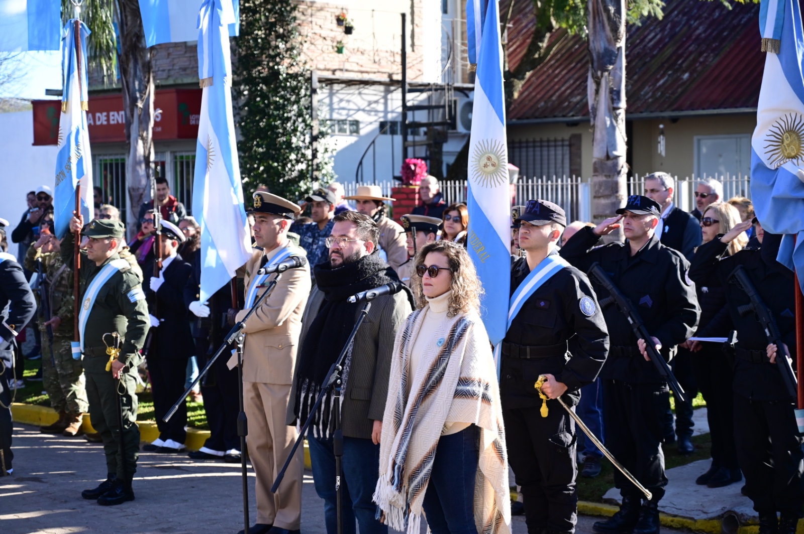 Este viernes 20 de junio, el intendente de Gualeguaychú, Mauricio Davico, y la viceintendenta Julieta Carrazza participaron del acto conmemorativo por el Día de la Bandera en la Plaza Manuel Belgrano de Pueblo General Belgrano. El evento reunió a autoridades municipales, provinciales y nacionales, fuerzas de seguridad, representantes de la Iglesia, docentes, alumnos y vecinos de la localidad.