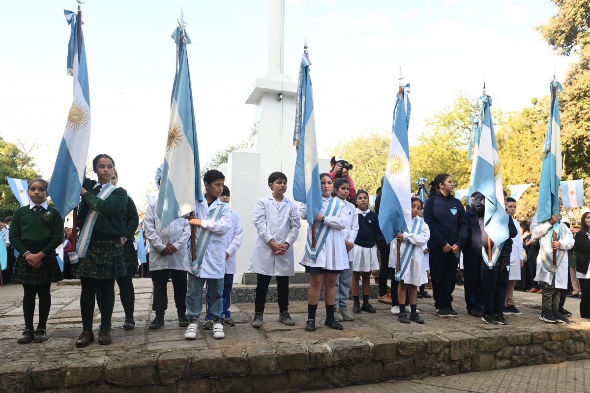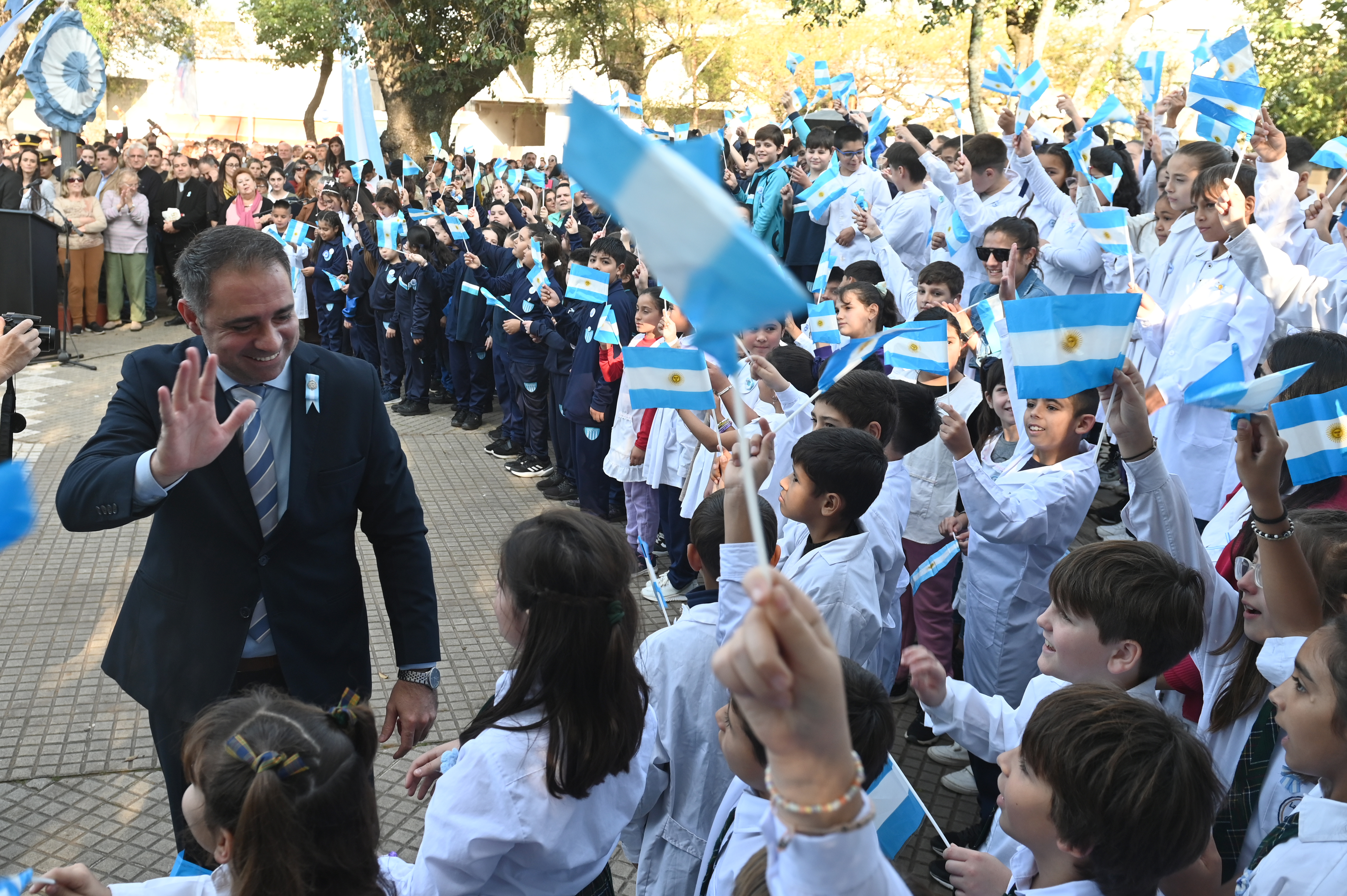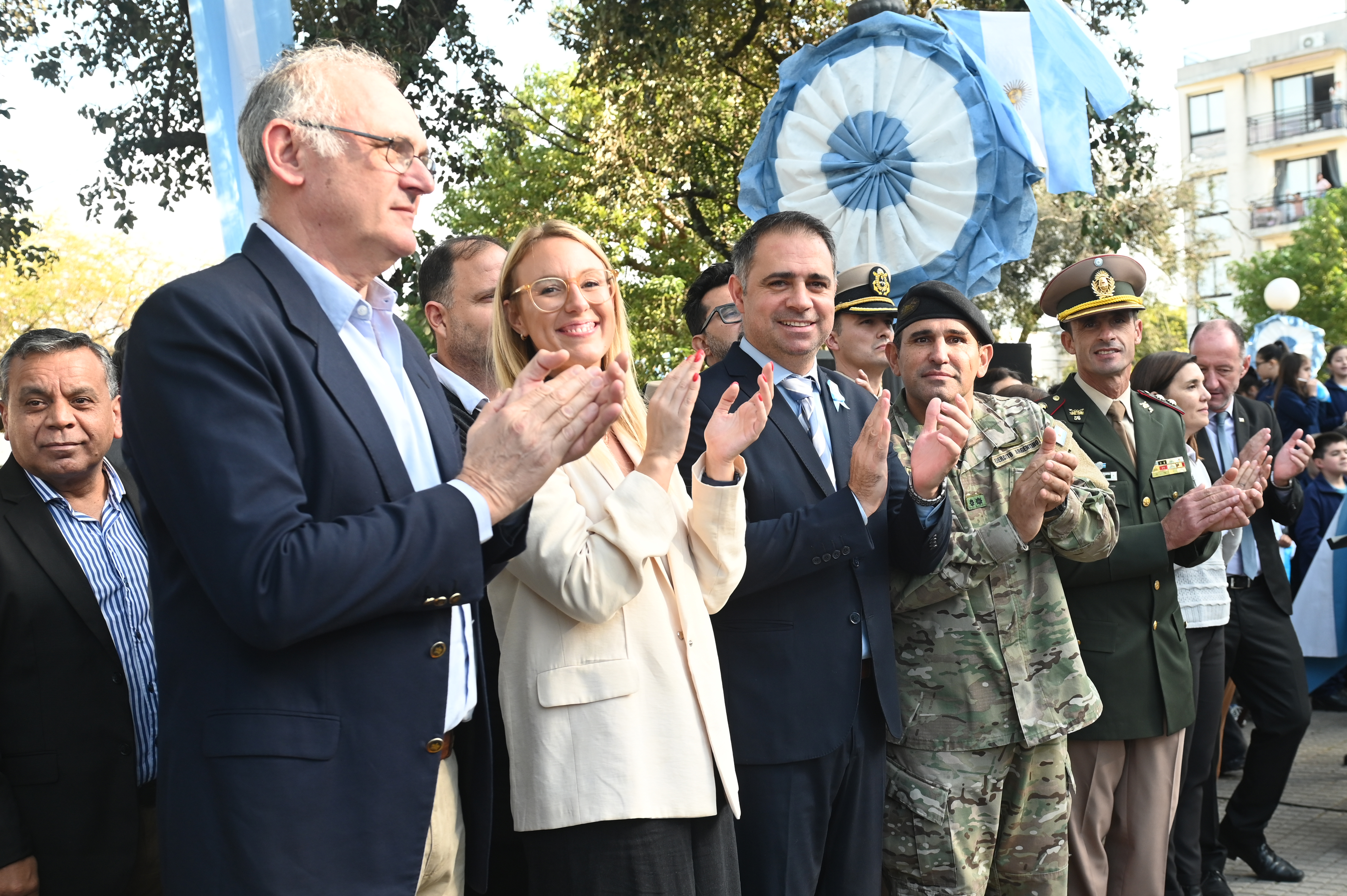 El acto fue presidido por el intendente Mauricio Davico y la viceintendente Julieta Carrazza, quienes estuvieron acompañados de funcionarios municipales y provinciales, representantes de las Fuerzas Armadas, de Seguridad, Policiales y Bomberos, alumnos de 4° grado de diferentes colegios, concejales y vecinos de la ciudad.