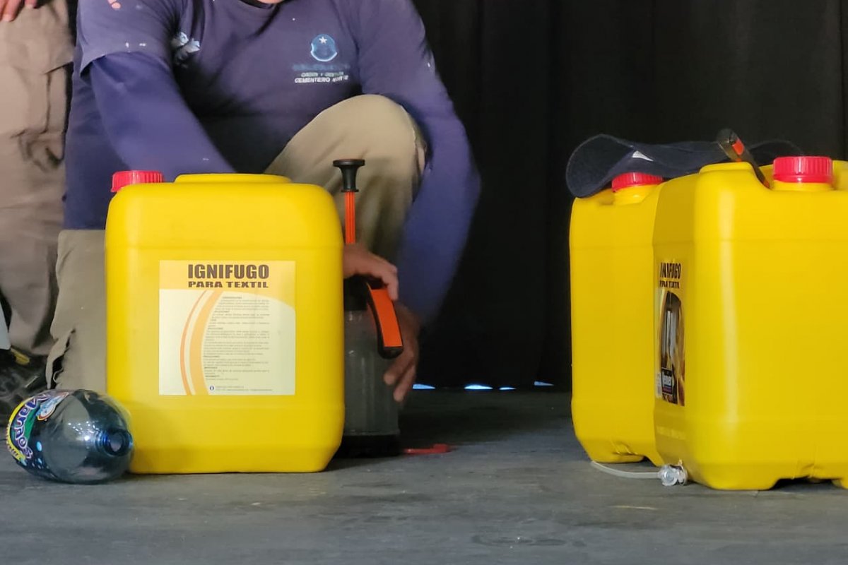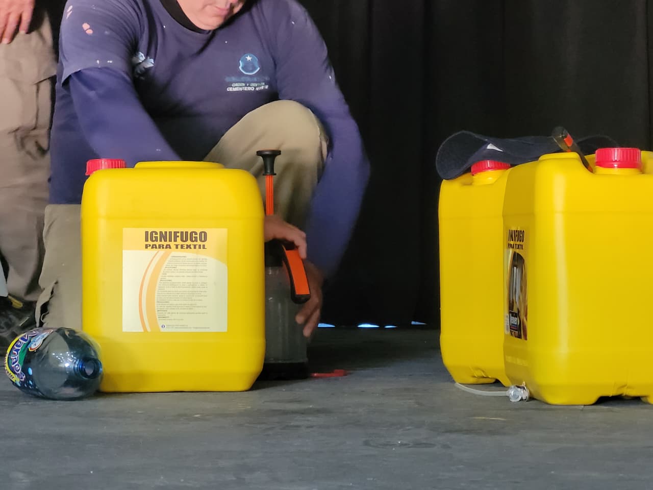 El procedimiento consistió en la aplicación de un producto específico ignífugo para textiles sobre todos los telones del escenario. El tratamiento fue realizado por personal especializado que, mediante pulverizadores manuales, aplicó cuidadosamente el líquido protector en cada una de las superficies de tela del teatro. El trabajo demandó varias horas y abarcó tanto el telón principal como las cortinas laterales y de fondo.